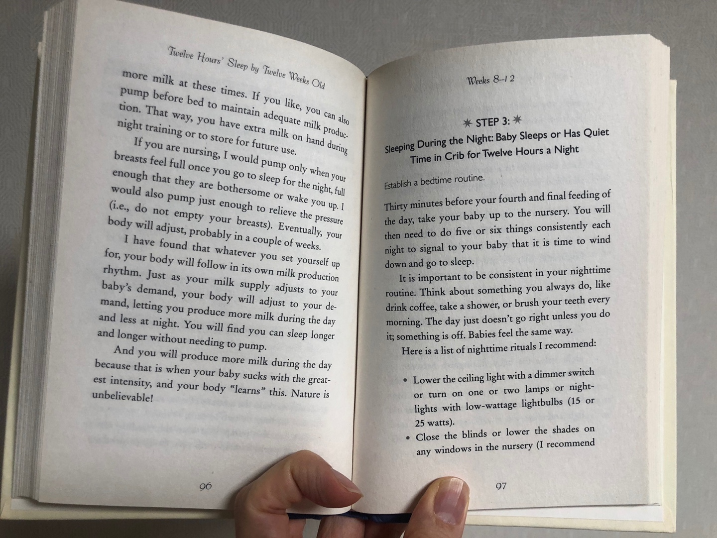 모든 아이들은 각자 다른 수면패턴을 갖고 있다. 어떤 아이는 12시간 자지만, 어떤 아이는 10시간 반 자고 깨버린다. 그러나, 아이는 반드시 아기 침대에 머물러야 한다. 아이는 하루를 시작하기 전까지 아기 침대에서 좋은 기분으로 혼자 즈릭고 있어야 한다. 다시 말해, 아이가 눈을 뜨자마자 소리 질러서 부모가 아이방으로 달려가서는 안된다.