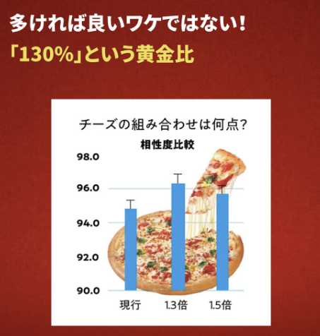 향과 맛, 깊이의 균형을 고려하여 바닥의 모짜렐라 치즈와 위의 고다 치즈 두 종류 중 모짜렐라 치즈를 현재 제품보다 "130%" 증가시키기로 했습니다.