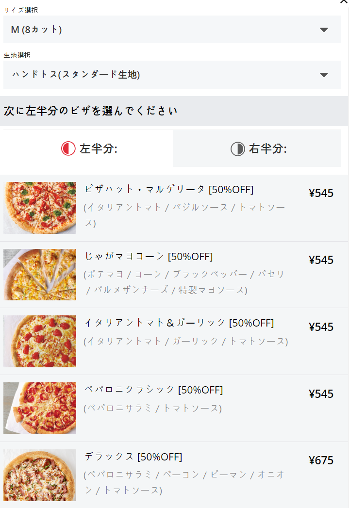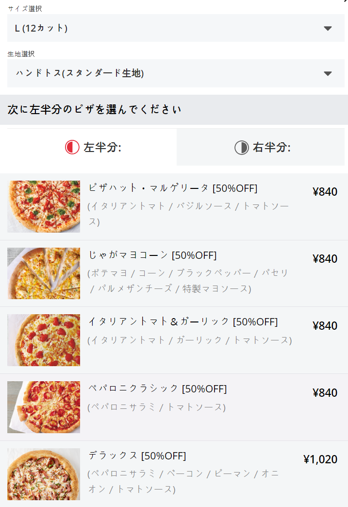 L 사이즈는 반쪽에 840엔 ~ 1,395엔 (한 판에 1,700엔 ~ 2,700엔)