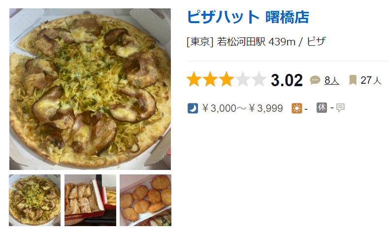 구글 평점 3.3점.. Pizza-La Yotsuya · 일본 〒160-0007 Tokyo, Shinjuku City, Arakicho, 20, Intec 88, 1F ★★★☆☆ · 피자 배달 www.google.com 타베로그는 평점이 없다.. ㅋㅋ ピザーラ 四ツ谷店 (曙橋/ピザ) ■予算(夜