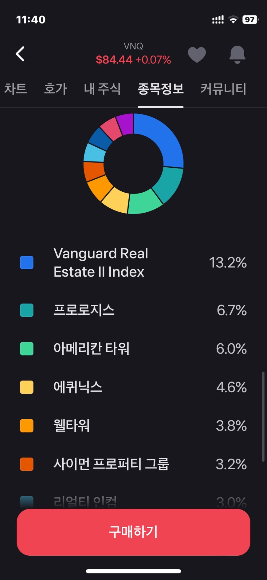 Vanguard Real Estate 13.2% / 프로로지스 6.7% / 아메리칸 타워 6.0% 등등..