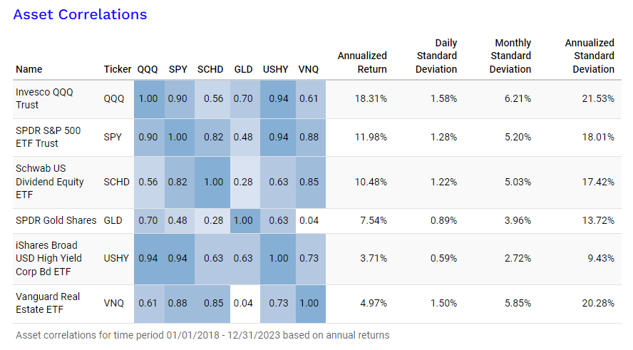 VNQ는 SPY SCHD 랑은 85% 이상, USHY랑은 73%, QQQ랑은 61%의 높은 상관관계를 보인다