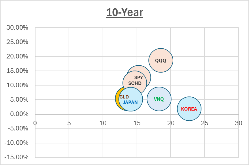 한가지 재밌는 점은 VNQ는 연간 수익률도 5% 수준으로 매우 낮은데 연간 표준편차가 거의 QQQ급으로 크다.. ㅋㅋㅋ