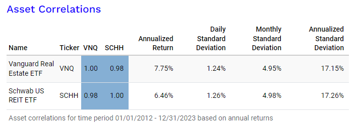 VNQ나 SCHH나 상관관계는 거의 1이다..