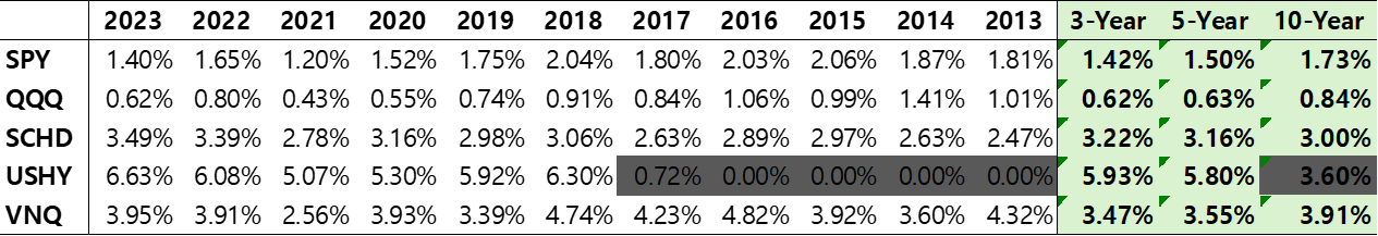 여러모로 SCHD보다 안정적이라는 건 이를 보면 알 수 있으니..