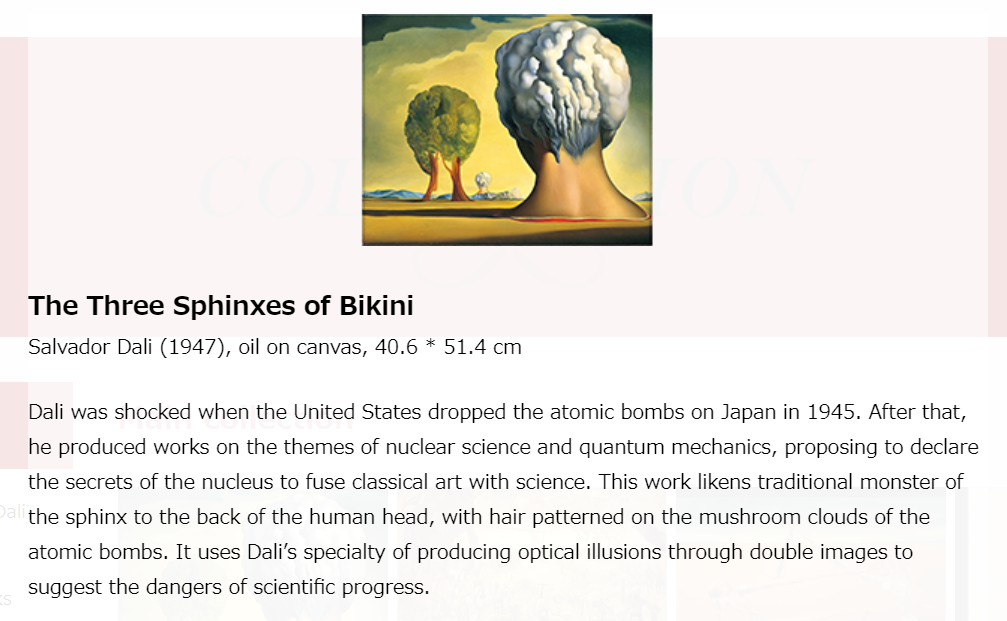 이 작품은 전통적인 스핑크스 괴물을 인간의 머리 뒷모습에 비유하고, 머리카락은 원자폭탄의 버섯구름 패턴으로 표현했습니다.