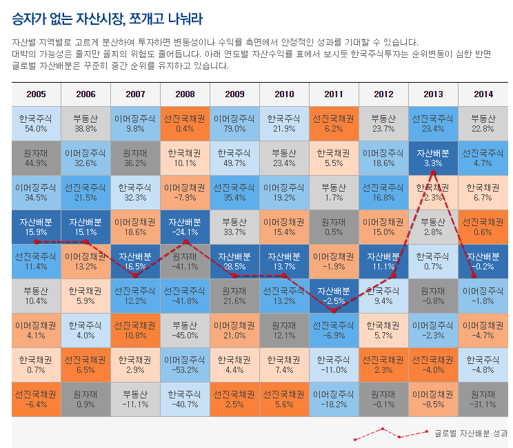 자산별·지역별로 고르게 분산하여 투자하면 변동성이나 수익률 측면에서 안정적인 성과를 기대할 수 있습니다. 대박의 가능성은 줄지만 꼴찌의 위험도 줄어듭니다. 아래 연도별 자산수익률 표