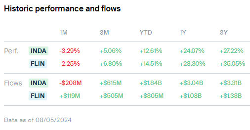 ETF comparison analysis of INDA and FLIN on performance, AuM, flows, costs, holdings, and liquidity