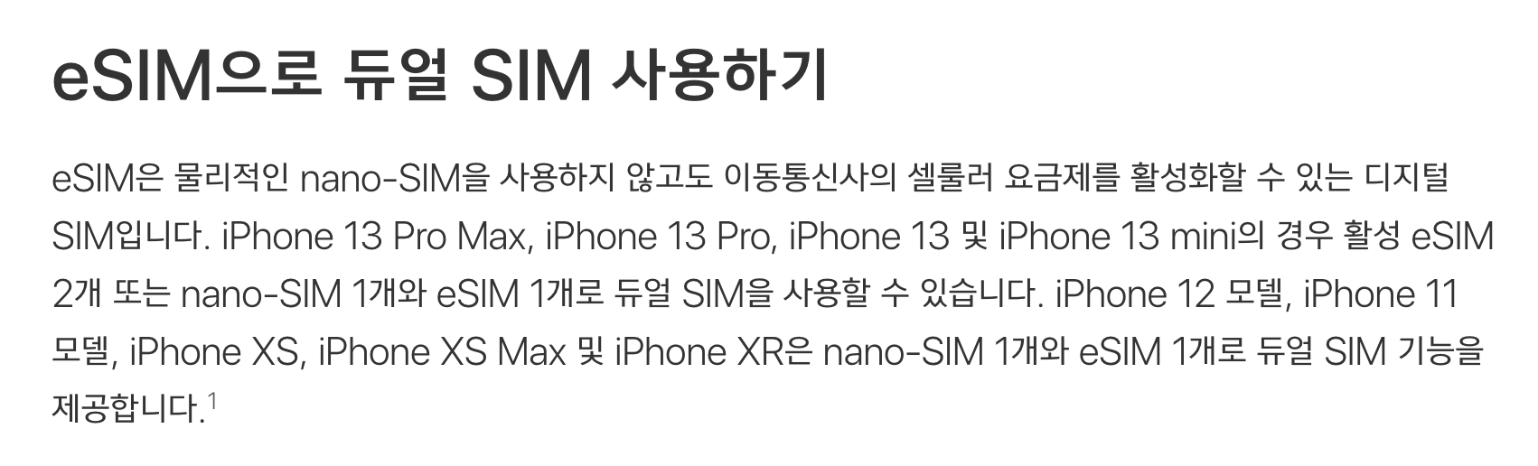 eSIM은 물리적인 nano-SIM을 사용하지 않고도 이동통신사의 셀룰러 요금제를 활성화할 수 있는 디지털 SIM입니다. iPhone 13 Pro Max, iPhone 13 Pro, iPhone 13 및 iPhone 13 mini의 경우 활성 eSIM 2개 또는 nano-SIM 1