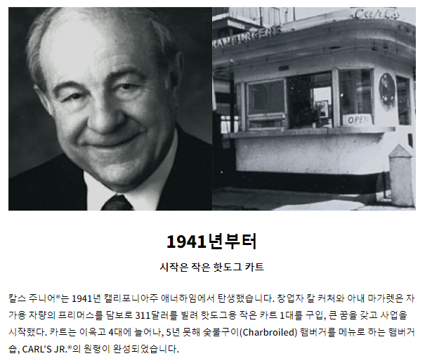 - 설립: 1941년, 카를 카처(Carl Karcher)와 그의 아내 마거릿(Margaret)이 캘리포니아 애너하임에서 핫도그 카트를 운영하면서 시작되었습니다.