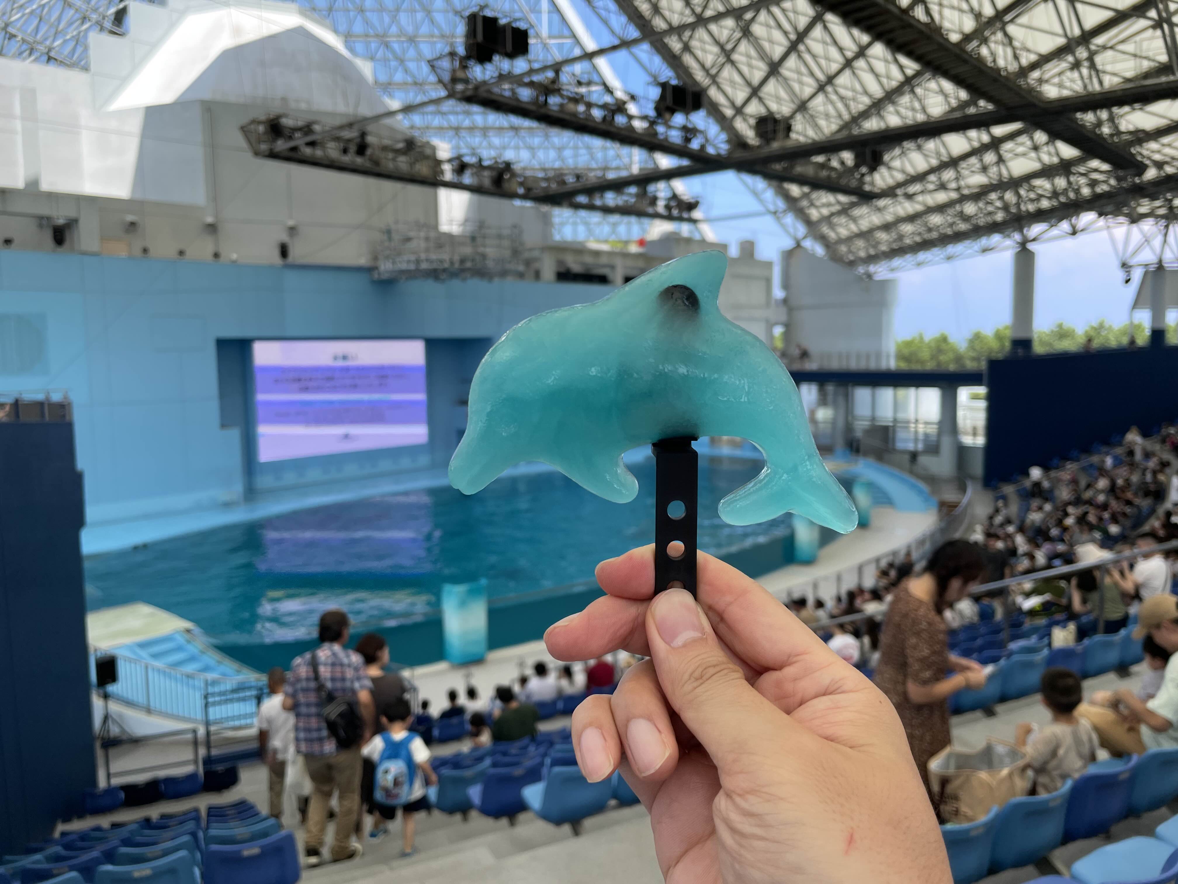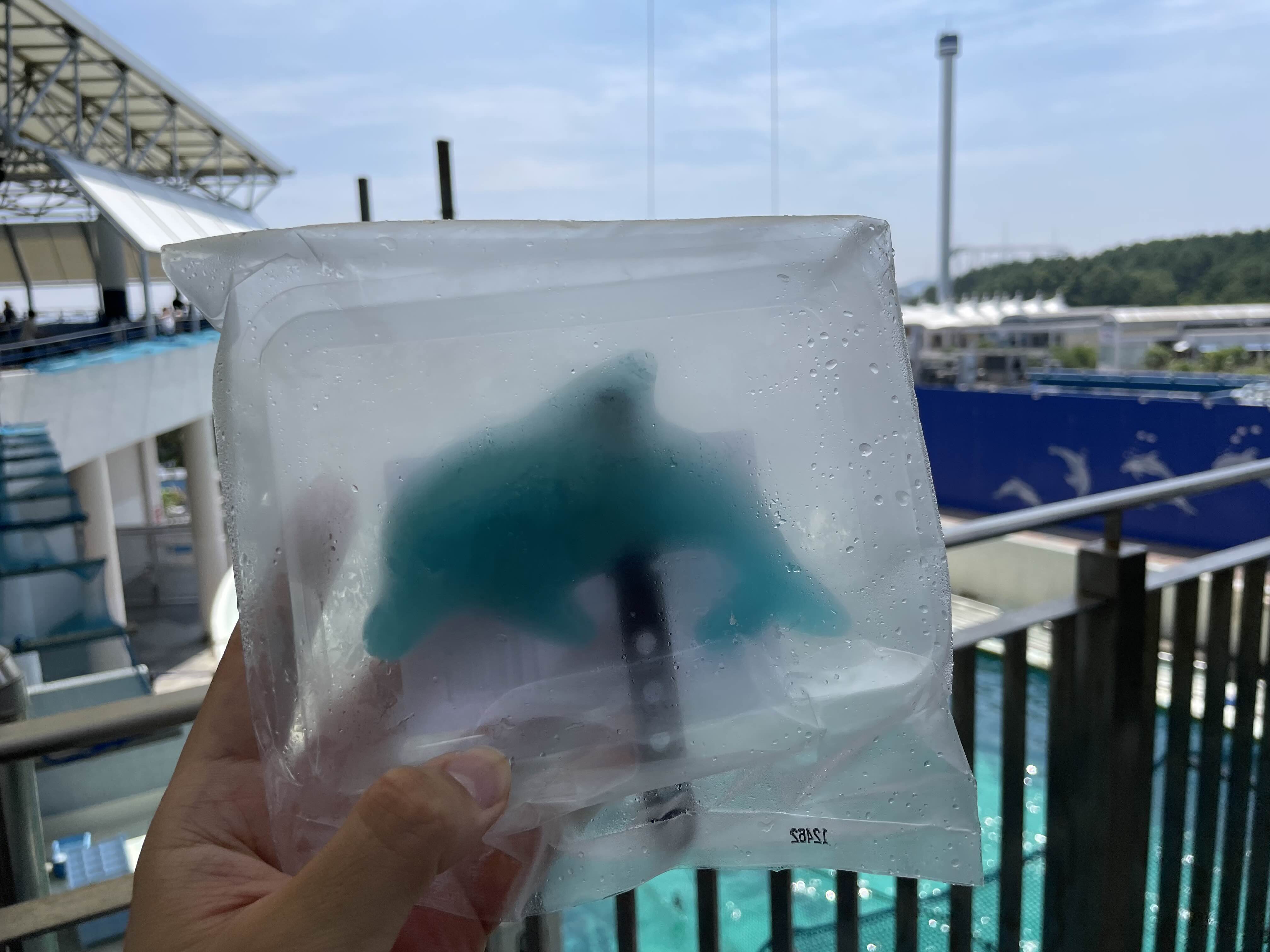 그리고 돌고래쇼를 보기 위해 기다리는데 너무 더워서 코도모와 함께 돌고래 아이스크림을 사먹었다