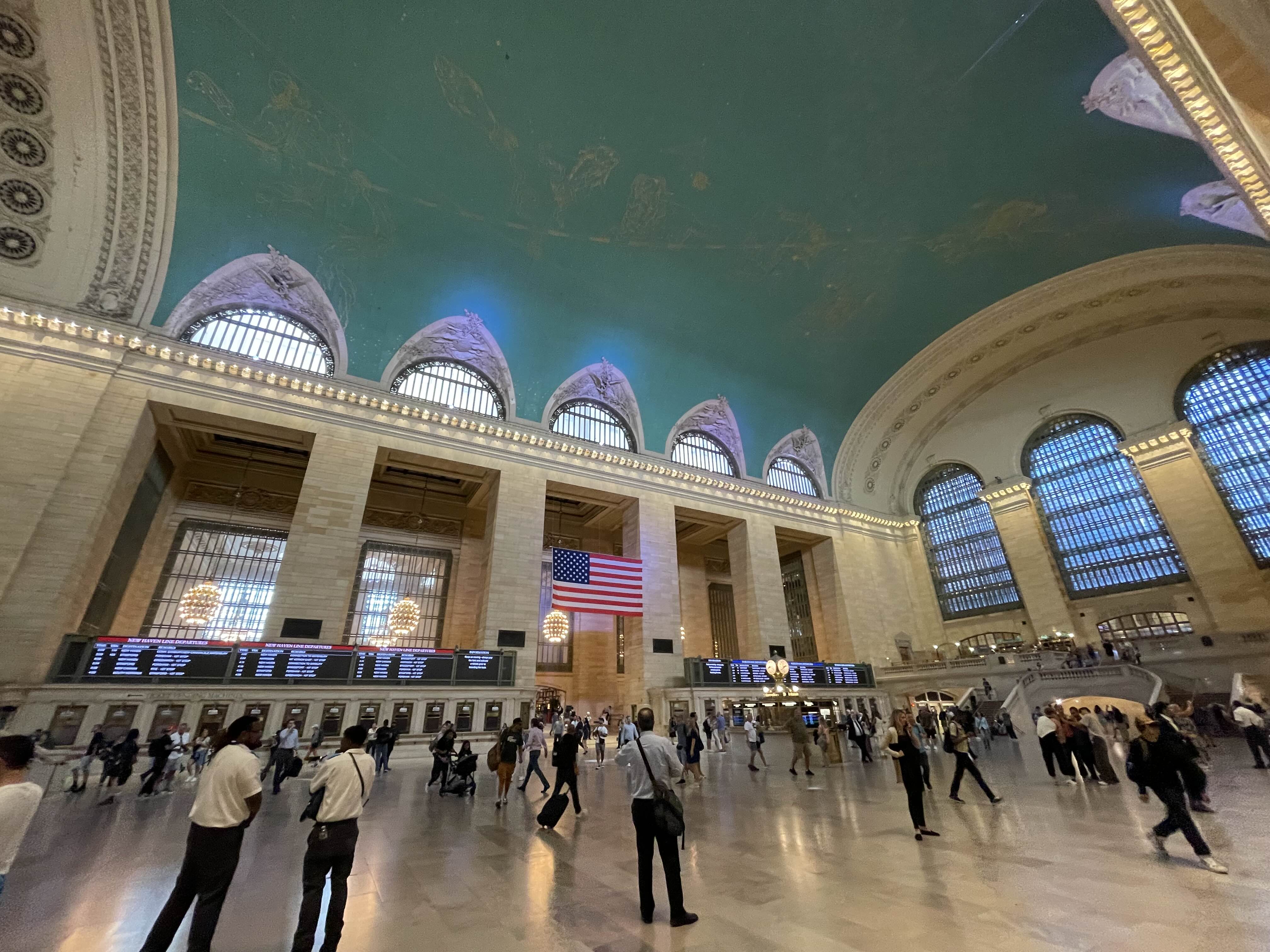 방문객들은 그랜드 센트럴의 웅장한 건축과 활기찬 분위기를 즐길 수 있습니다.