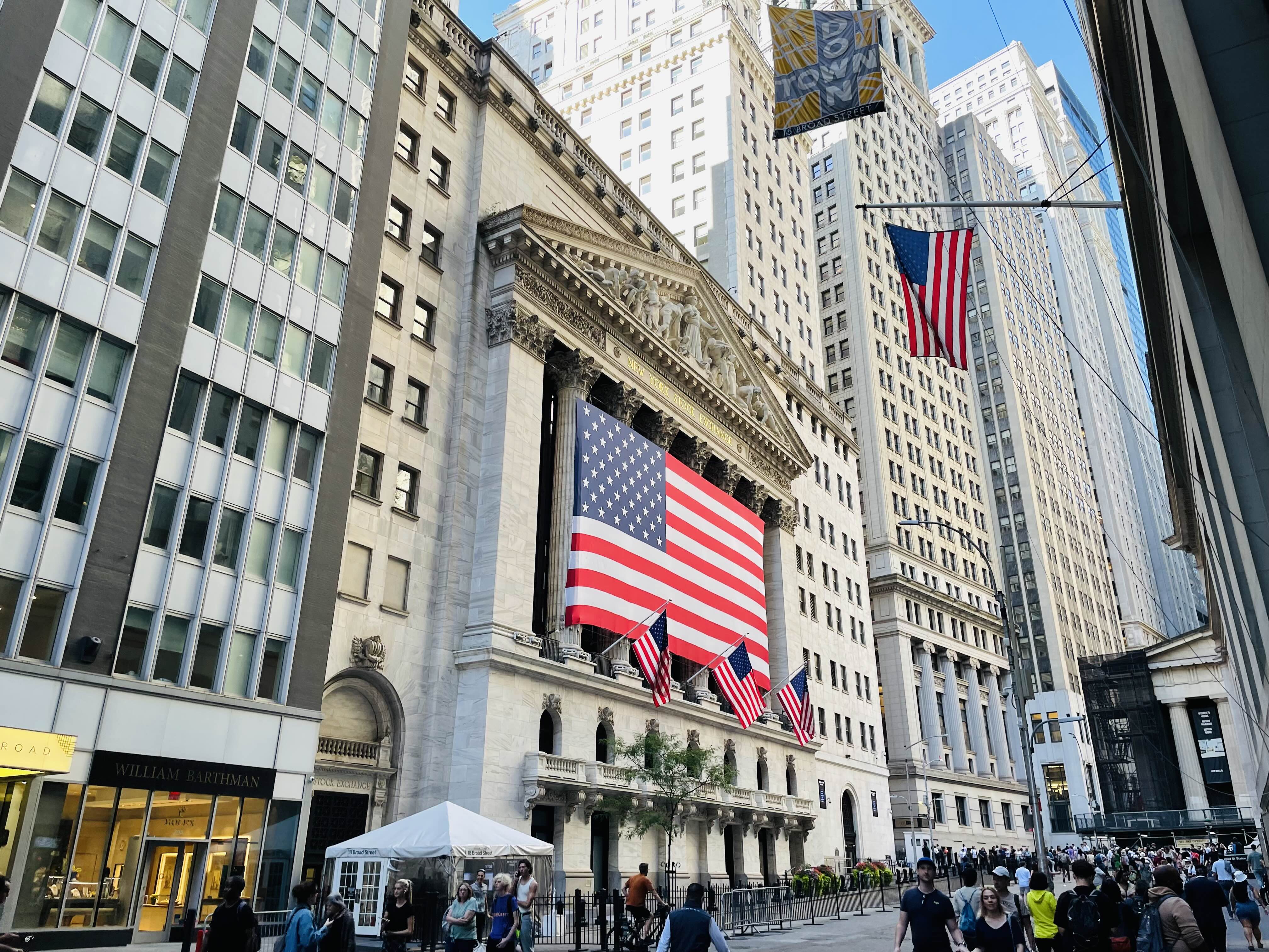 월스트리트에 위치한 NYSE는 미국 자본주의와 금융 산업의 상징으로 여겨집니다.