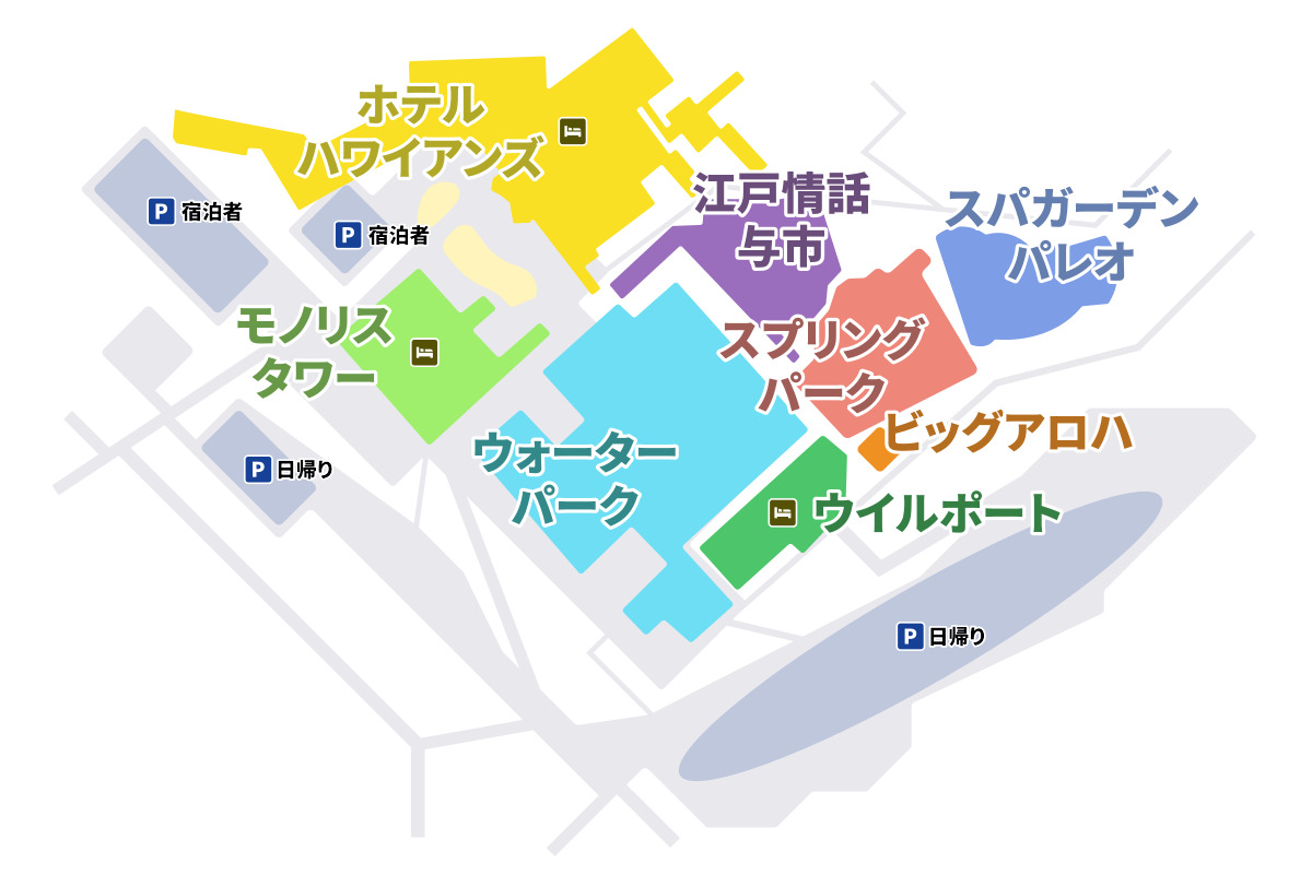 그리고 시설로는 하늘색 워터파크 덩어리, 주황색 스프링파크 & 파란색 스파가든을 세트로 보면 된다