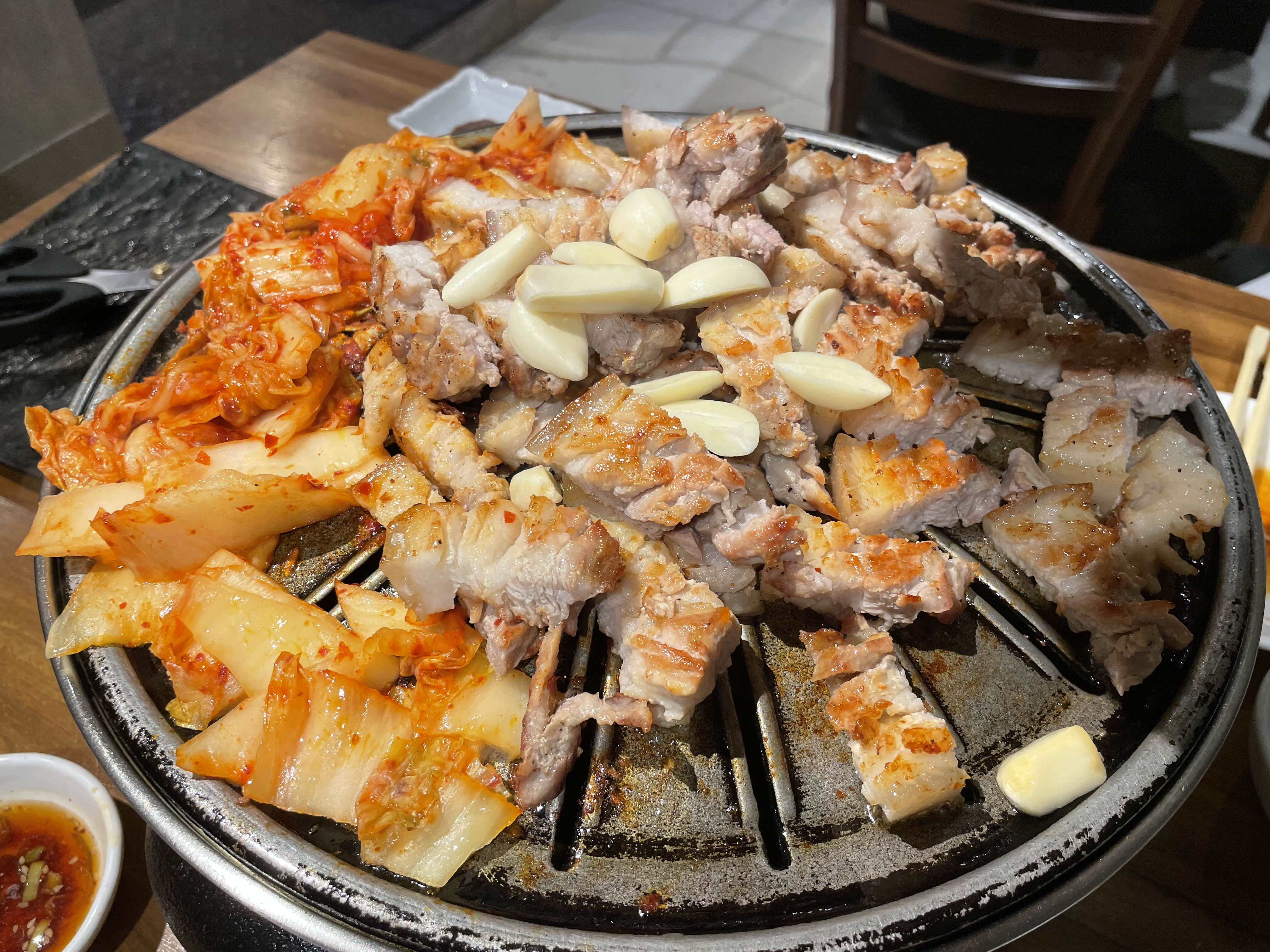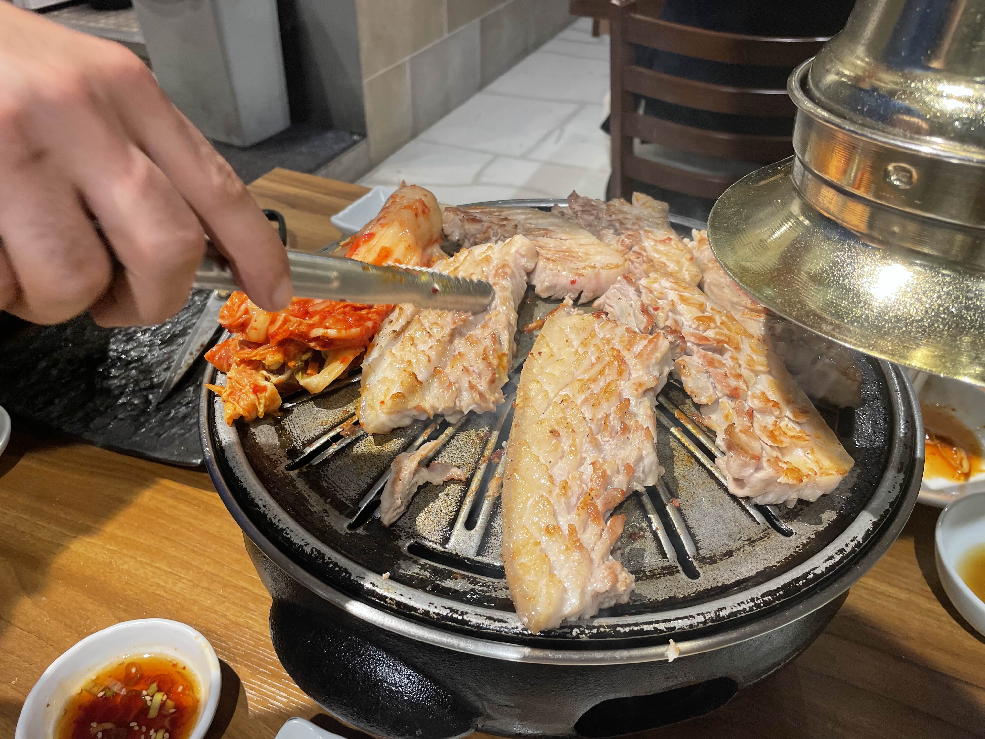 고기 자르는 솜씨도 예사롭지 않고 김치를 깔아주는것도 완전 한국이다