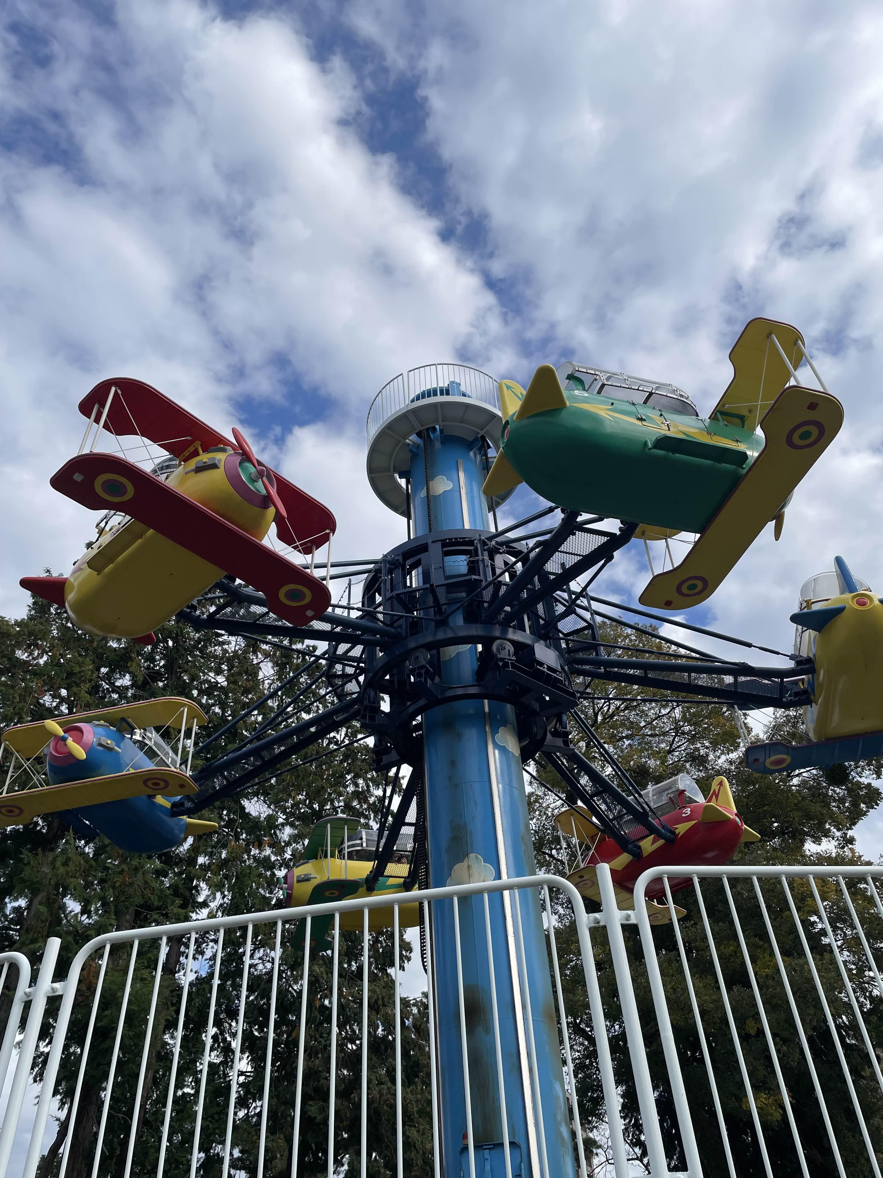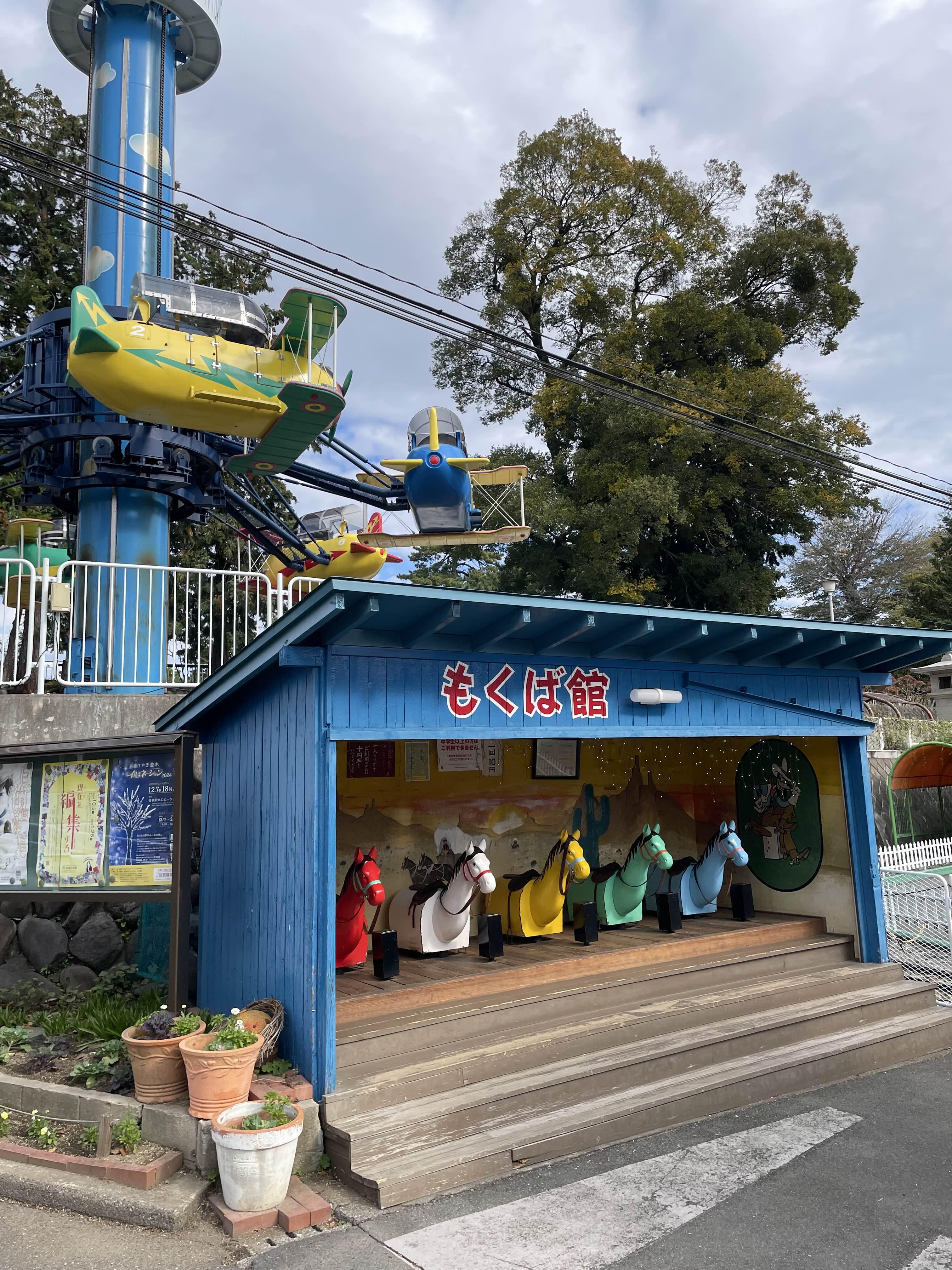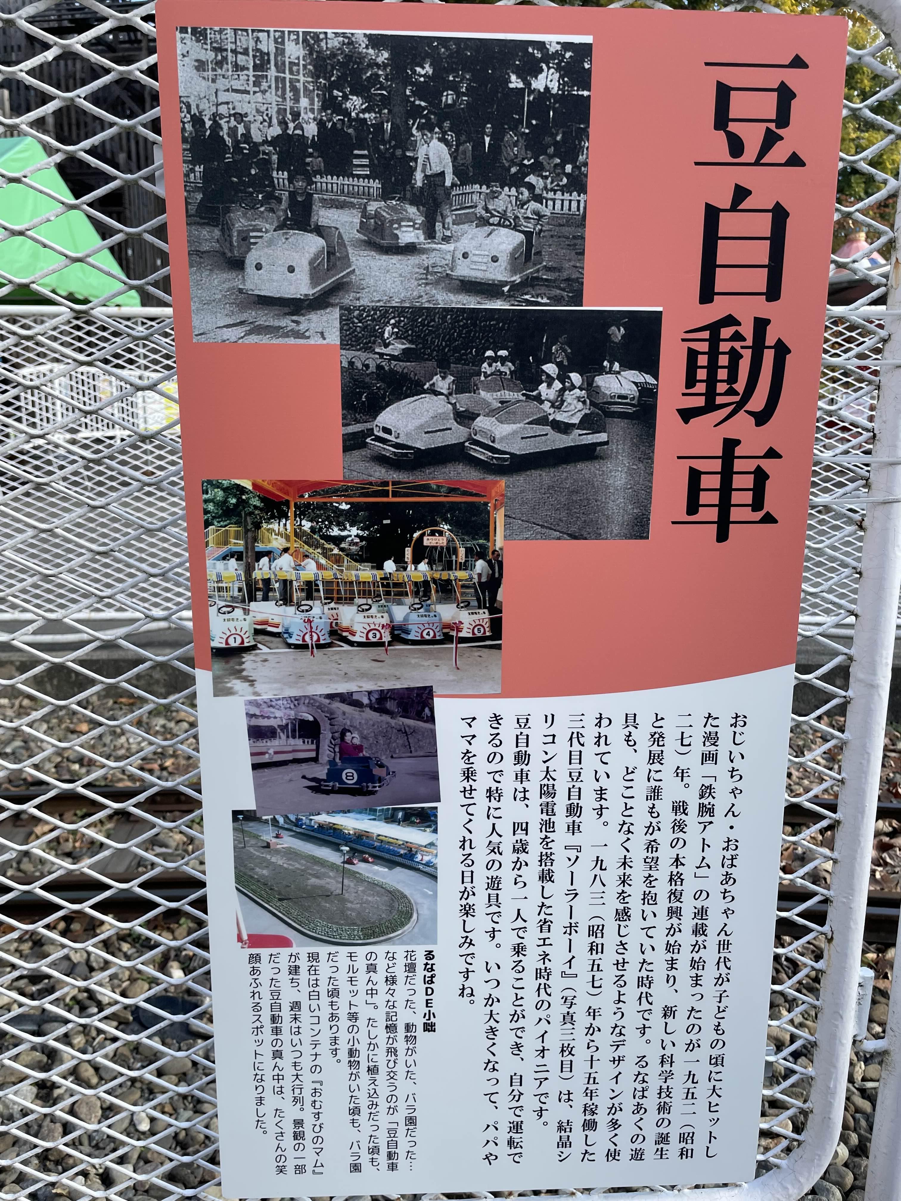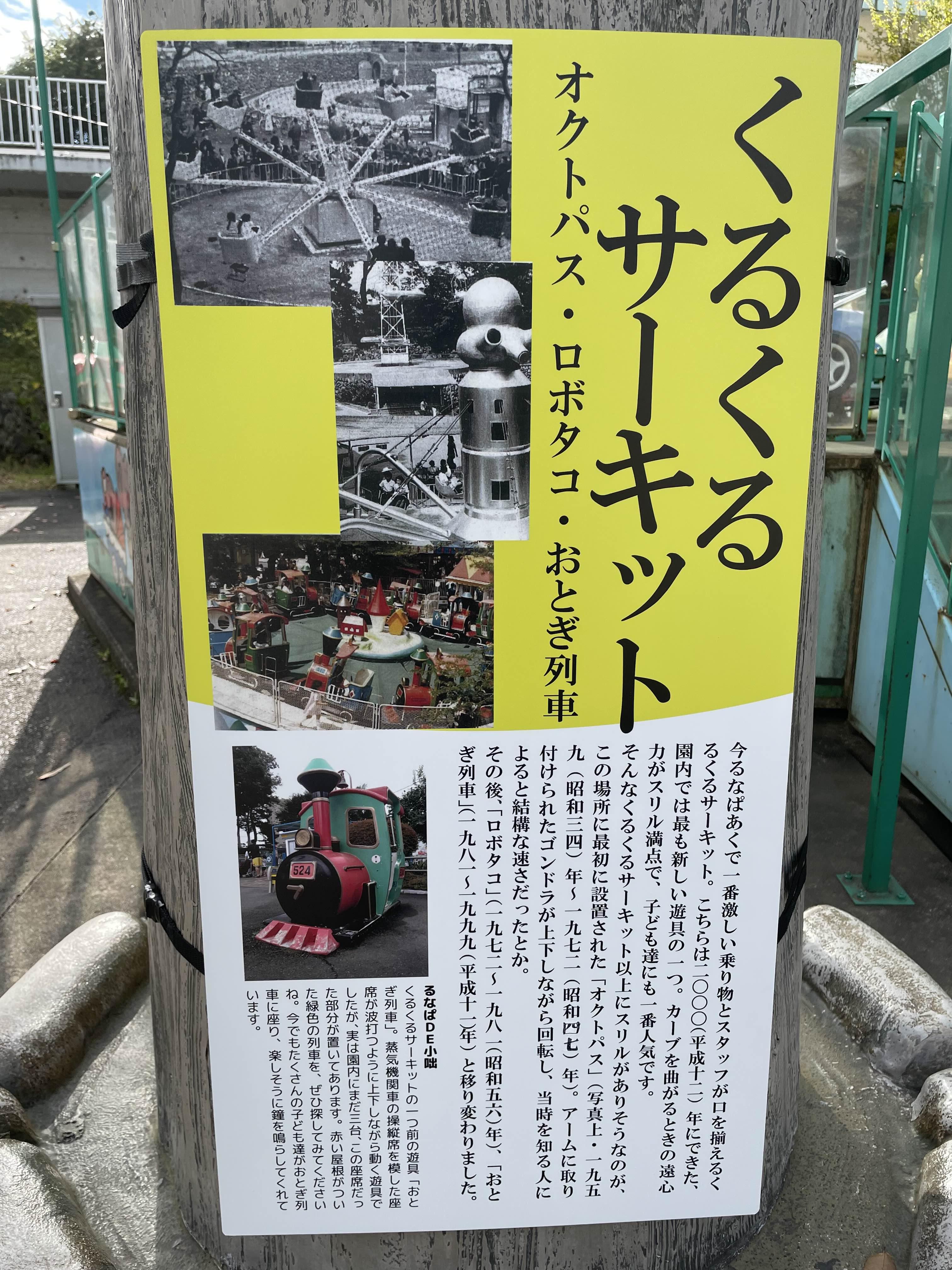 "쿠루쿠루 서킷"의 하나 전 놀이기구인 "오토기 열차". 증기 기관차의 조종을 모방한 좌석이 물결치듯 위아래로 움직이는 놀이기구였지만, 사실 공원 내에 아직 세 대의 이 좌석이 남아 있습니다.