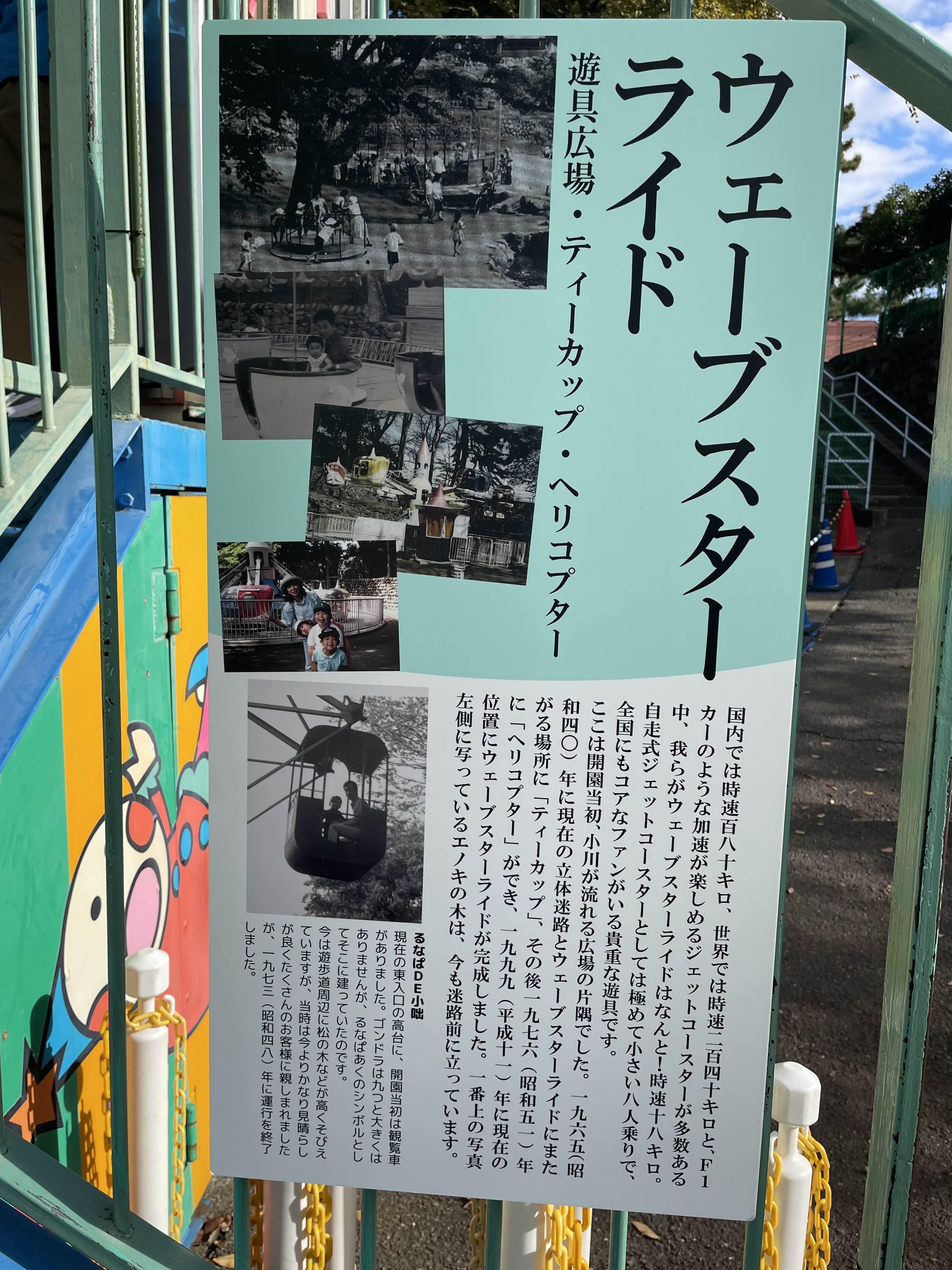 1965년(쇼와 40년)에 현재의 입체 미로와 웨이브 스타 라이드가 걸쳐 있는 장소에 "티컵"이 설치되었고, 그 후 1976년(쇼와 51년)에 "헬리콥터"가 설치되었으며, 1999년(헤이세이 11년)에 현재 위치에 웨이브 스타 라이드가 완성되었습니다. 맨 위 사진의 왼쪽에 찍힌 에노키 나무는 지금도 미로 앞에 서 있습니다.