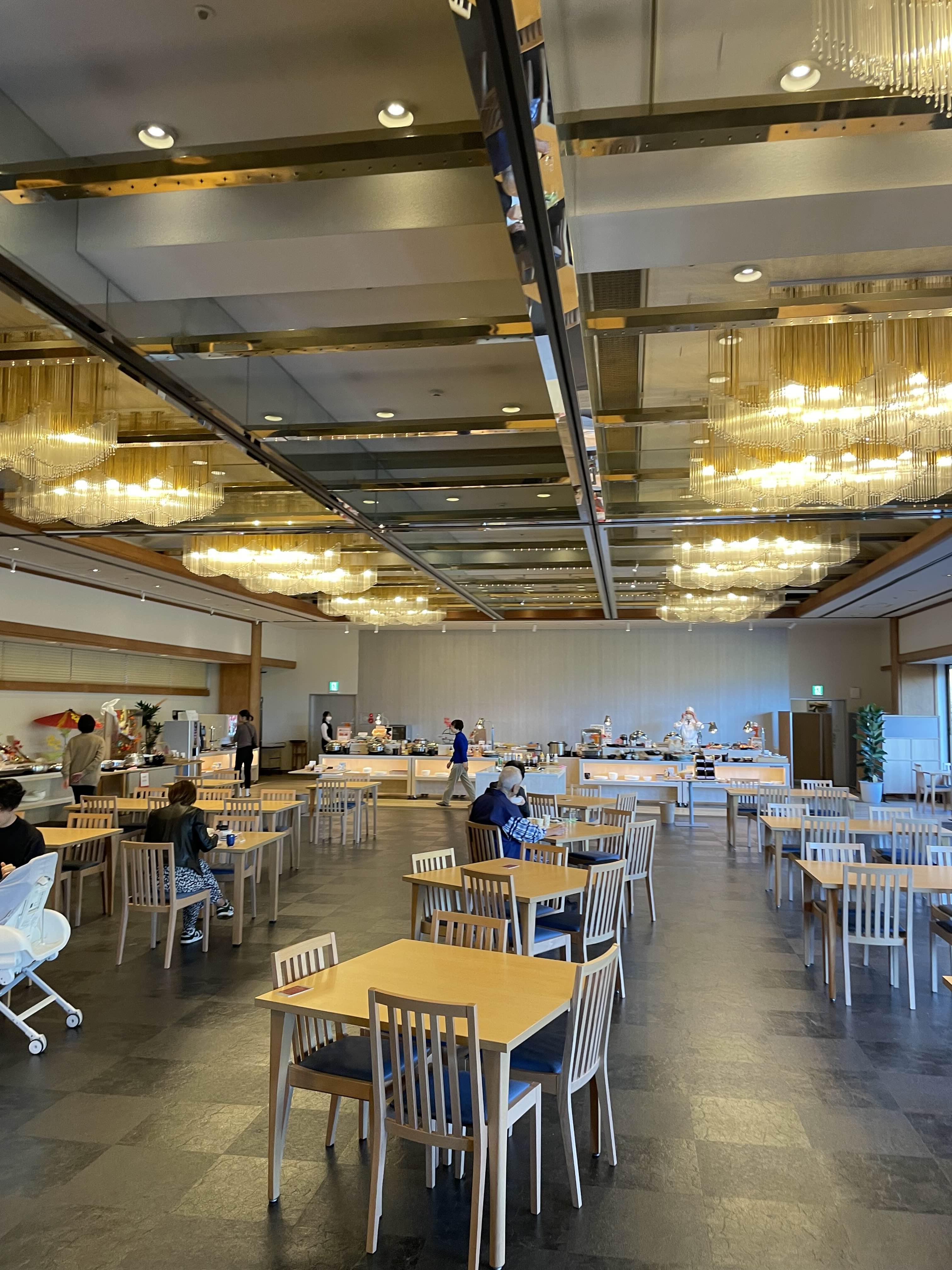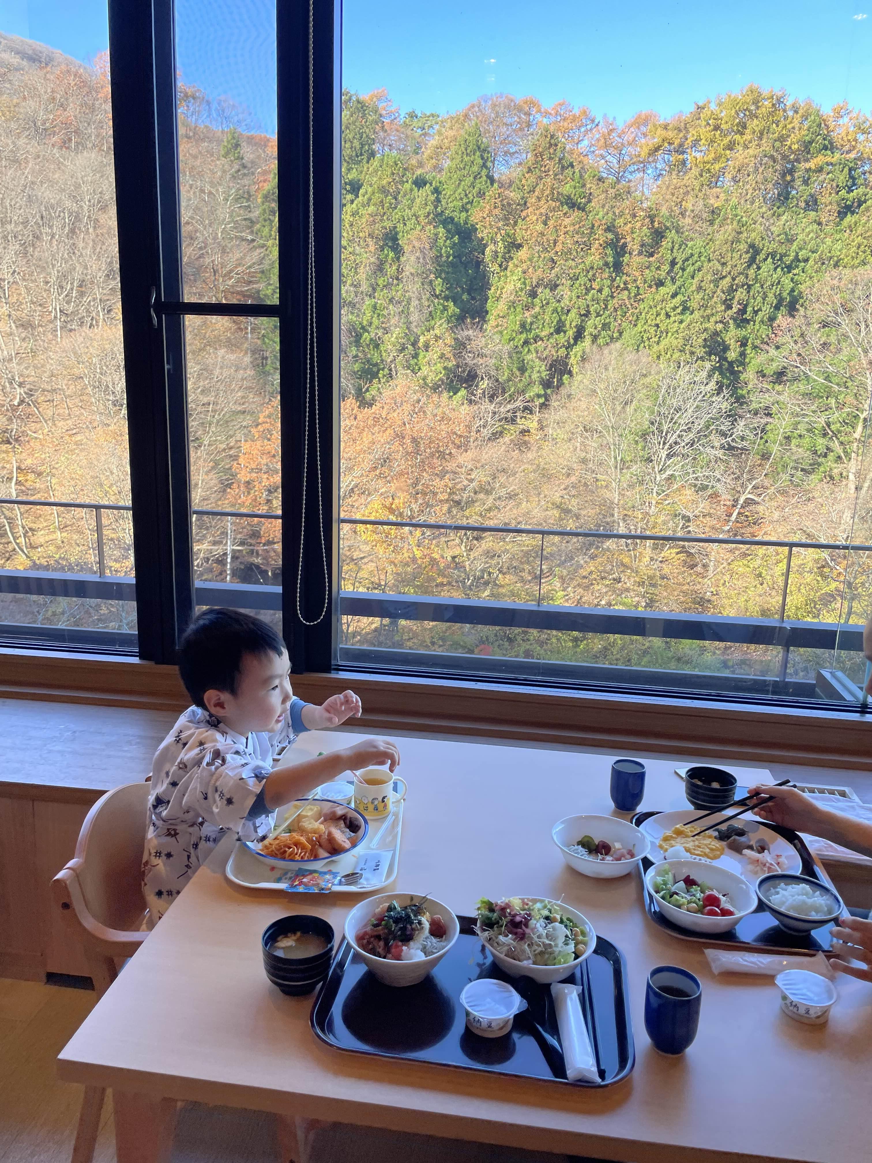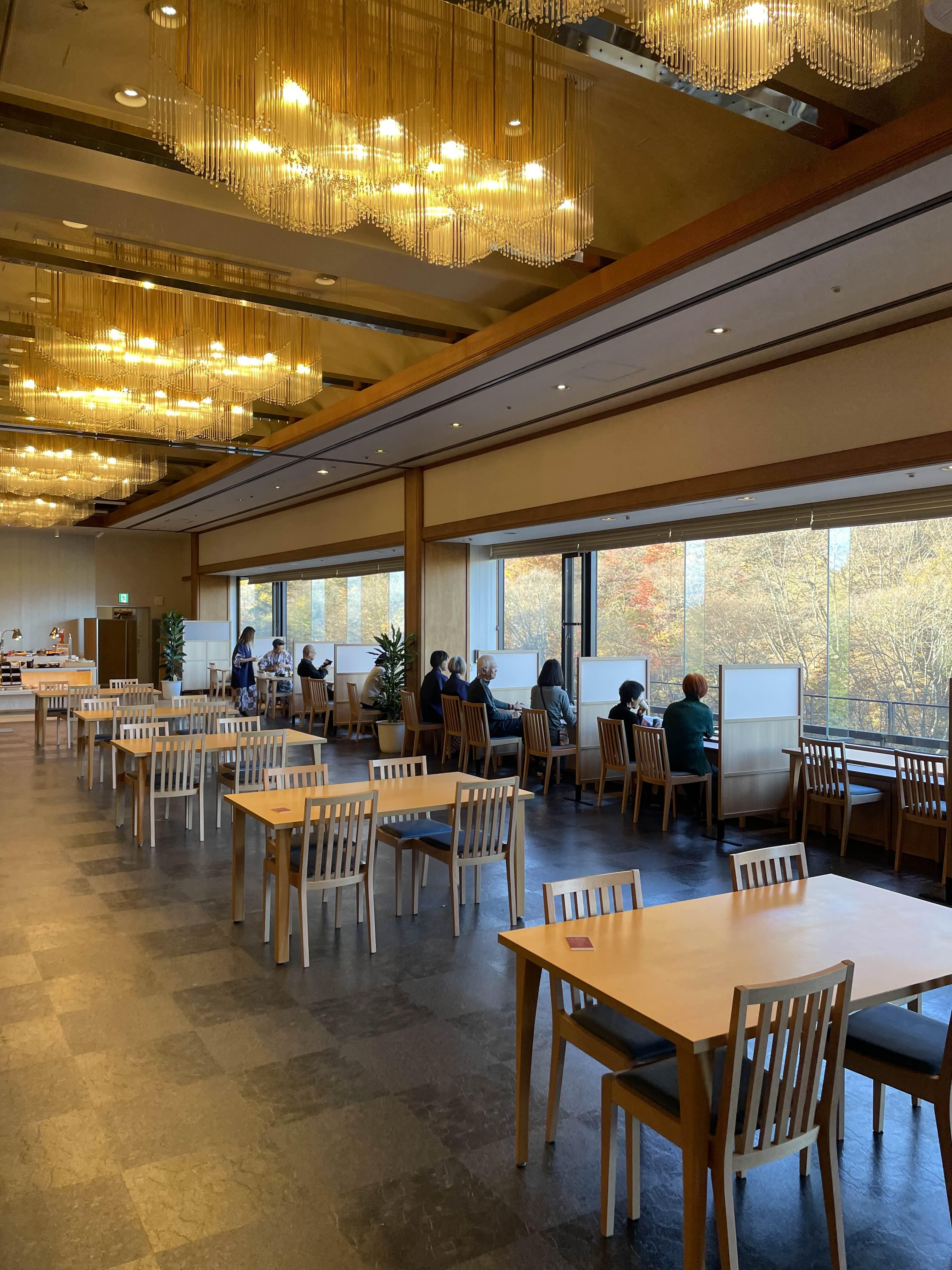 천장이 높고 가을 정취를 바라보면서 다들 식사를 하고 있다