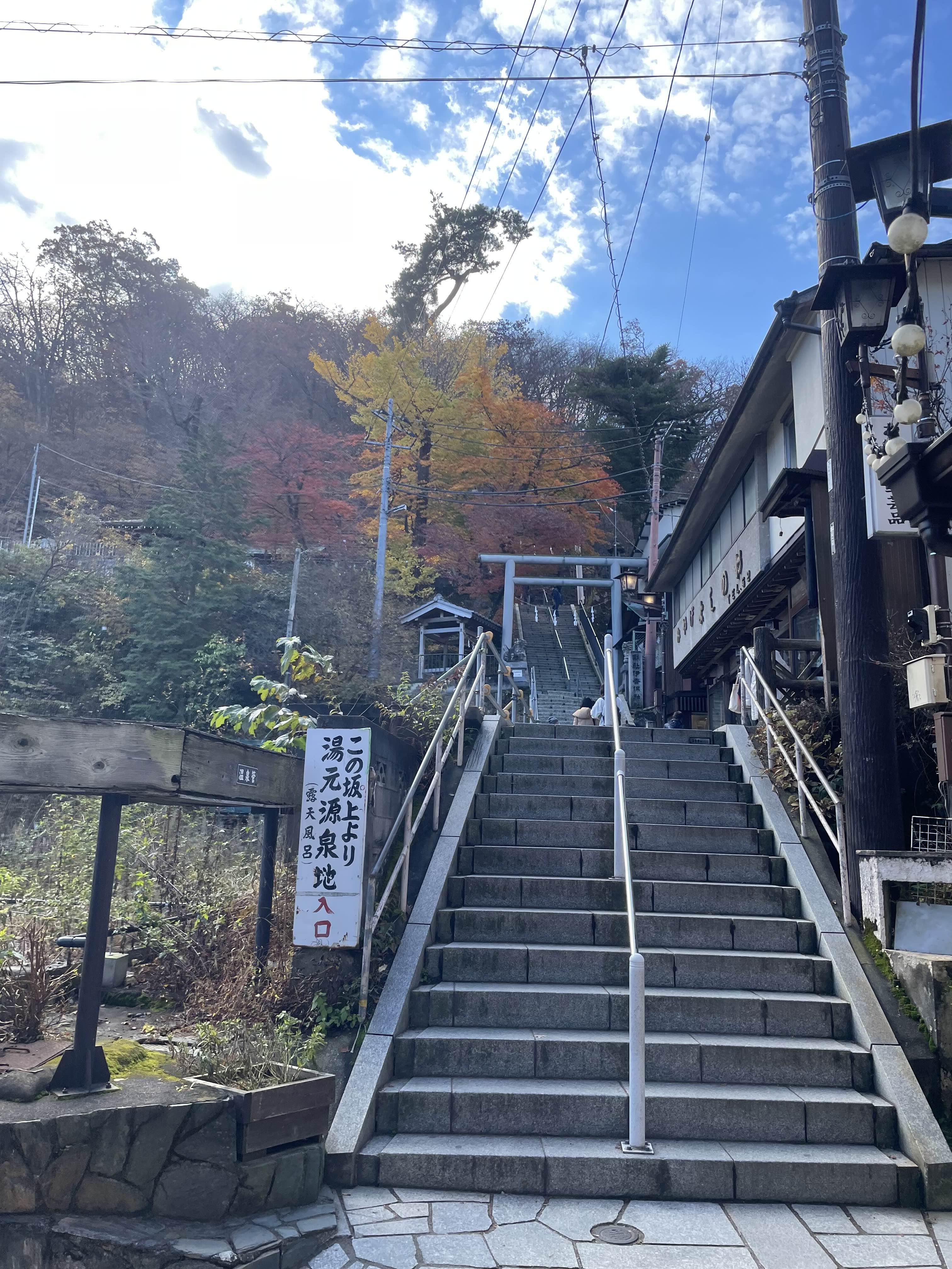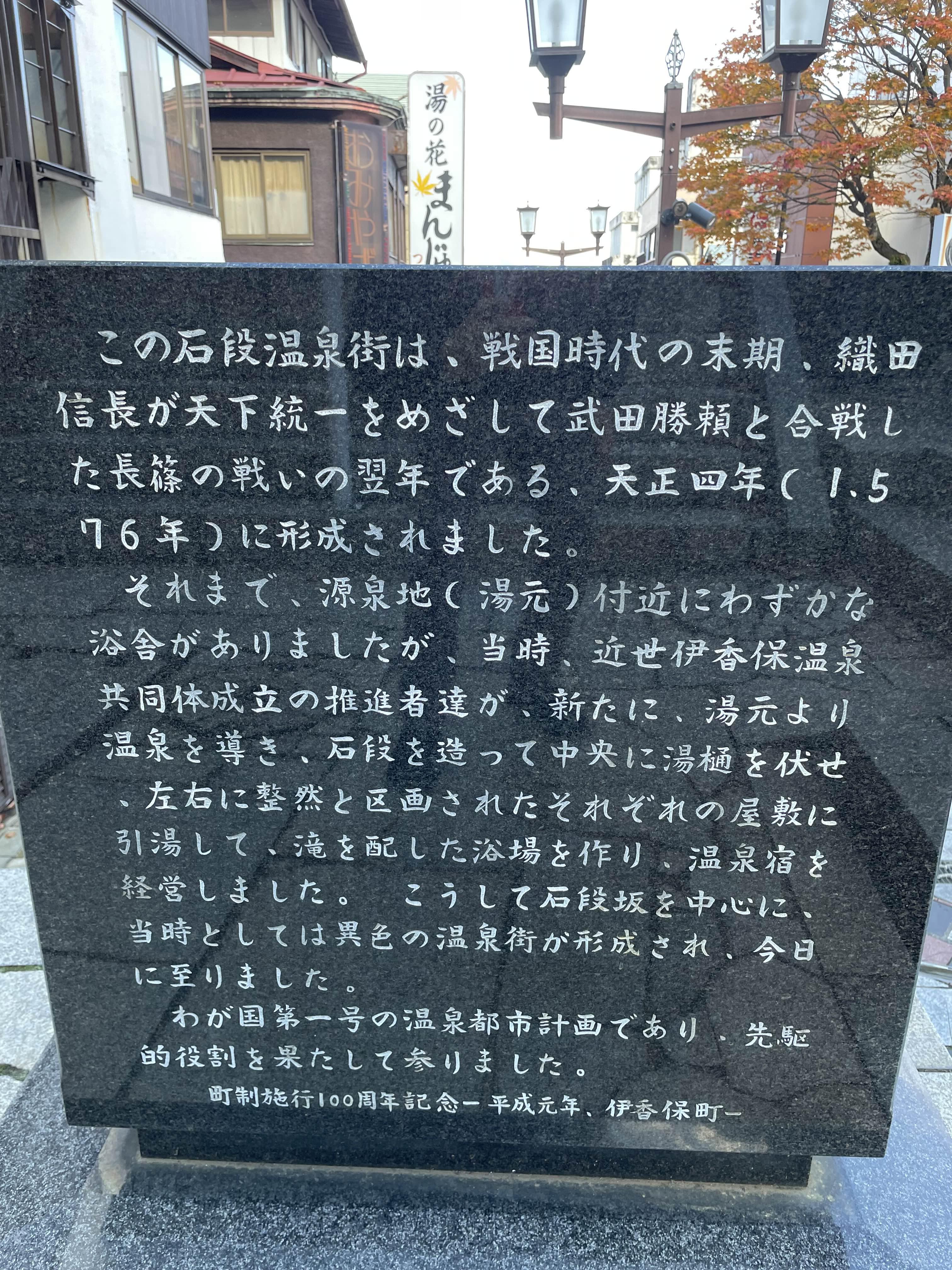 이 돌계단 온천가는 전국 시대 말기, 오다 노부나가가 천하 통일을 목표로 다케다 가쓰요리와 싸운 나가시노 전투의 다음 해인 덴쇼 4년(1576년)에 형성되었습니다.