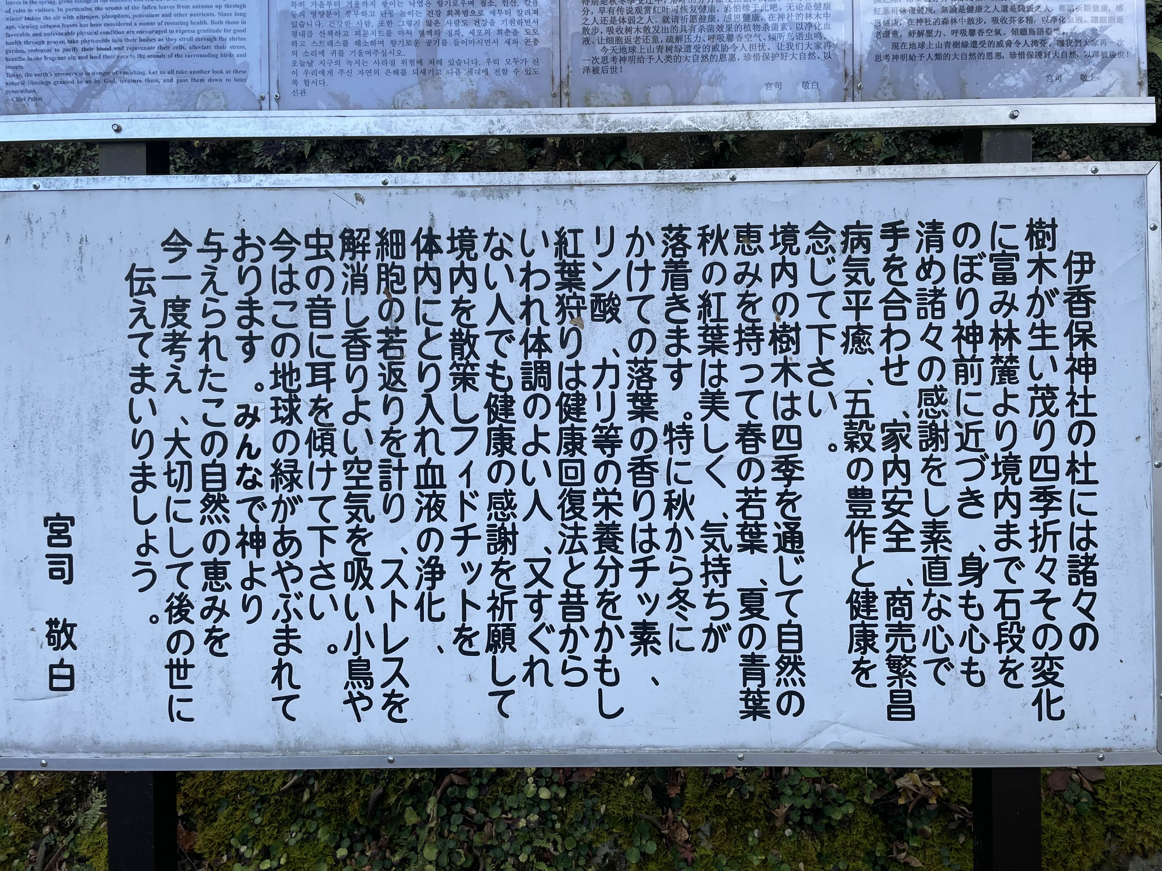 숲의 기슭에서 경내까지 돌계단을 오르며 신전으로 가까이 다가가, 몸과 마음을 정화하고 여러 가지 감사의 마음을 담아 순수한 마음으로 손을 모아 가내 안전, 사업 번창, 병 고침, 오곡의 풍작과 건강을 기원해 주세요.