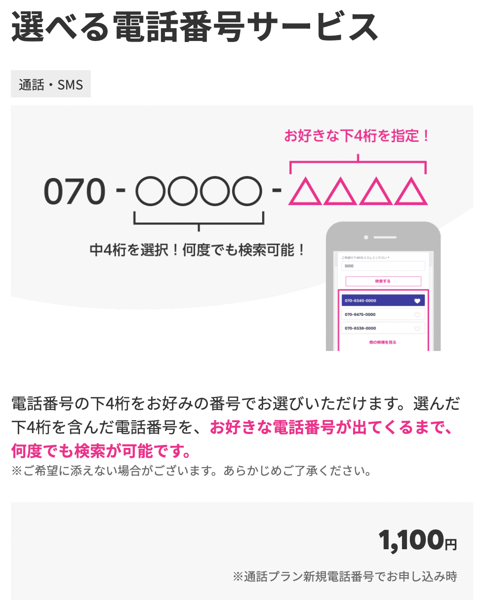 라쿠텐은 1,100엔만 가입할 때 단발성으로 지불하면 번호를 지정할 수 있다.