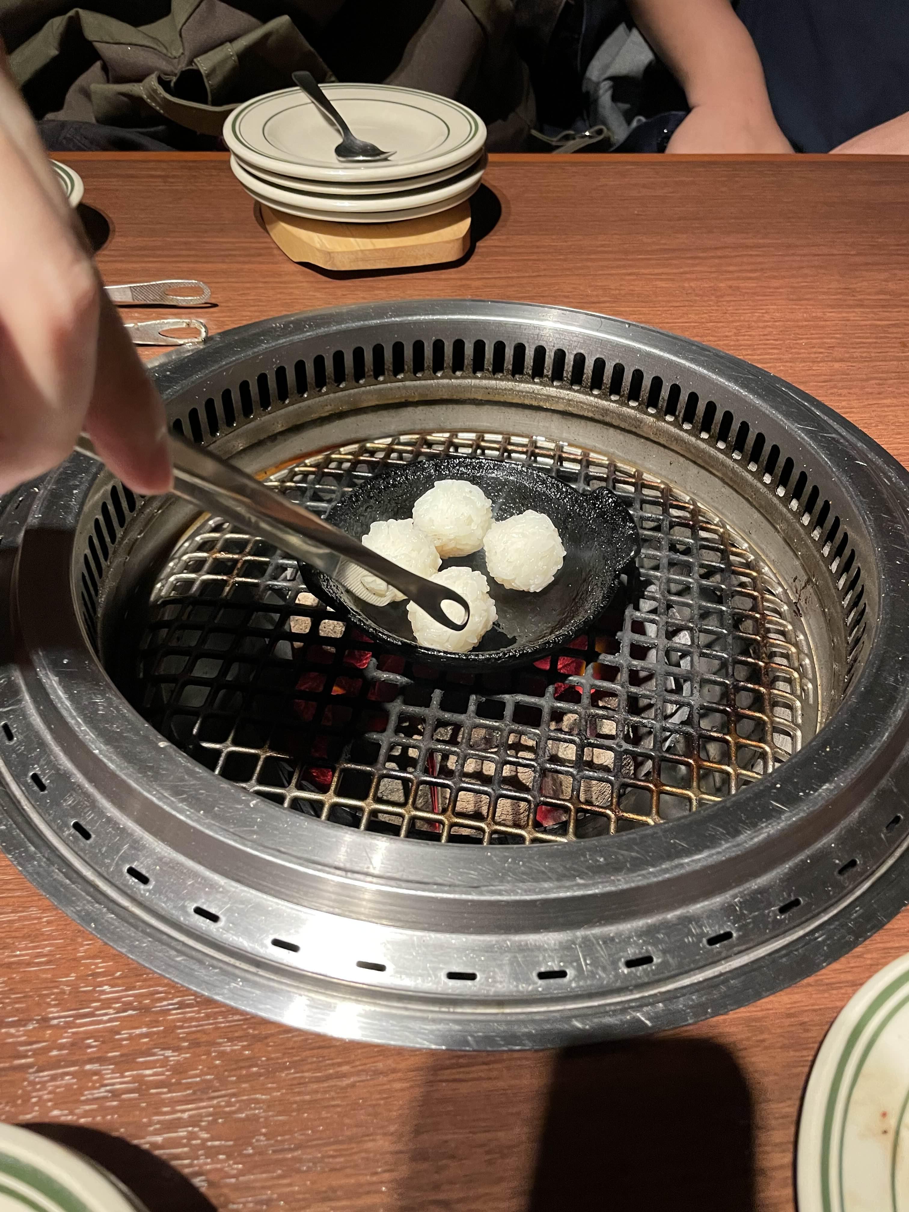 이건 쌈싸주는 느낌인데 일단 밥을 석쇠로 겉을 굽는다