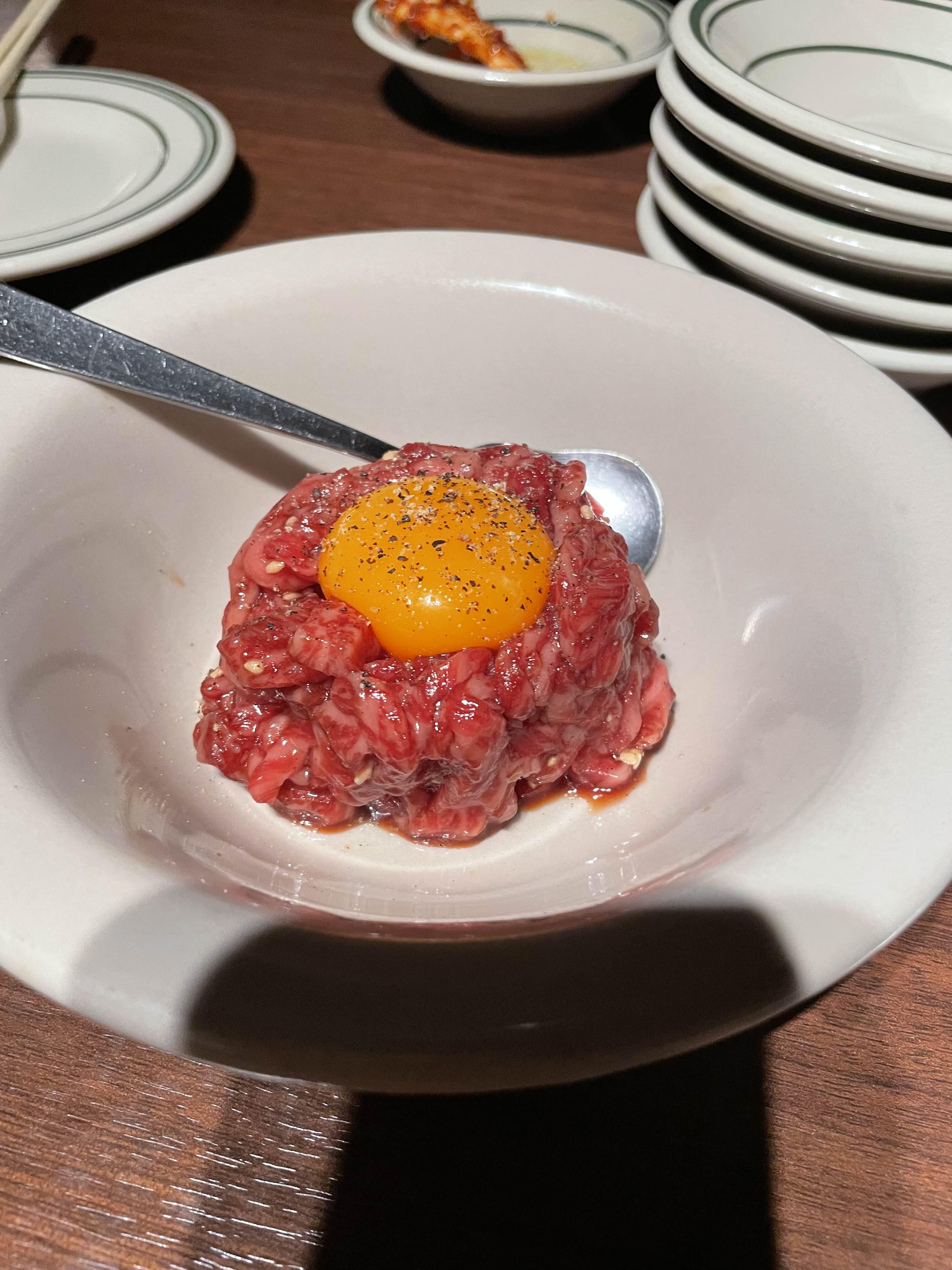 이곳은 생식용 식육 취급 인정점을 허가받아 신선한 생고기 메뉴를 안심하고 맛볼 수 있으며, 코스 요리는 7,700엔부터 시작합니다.