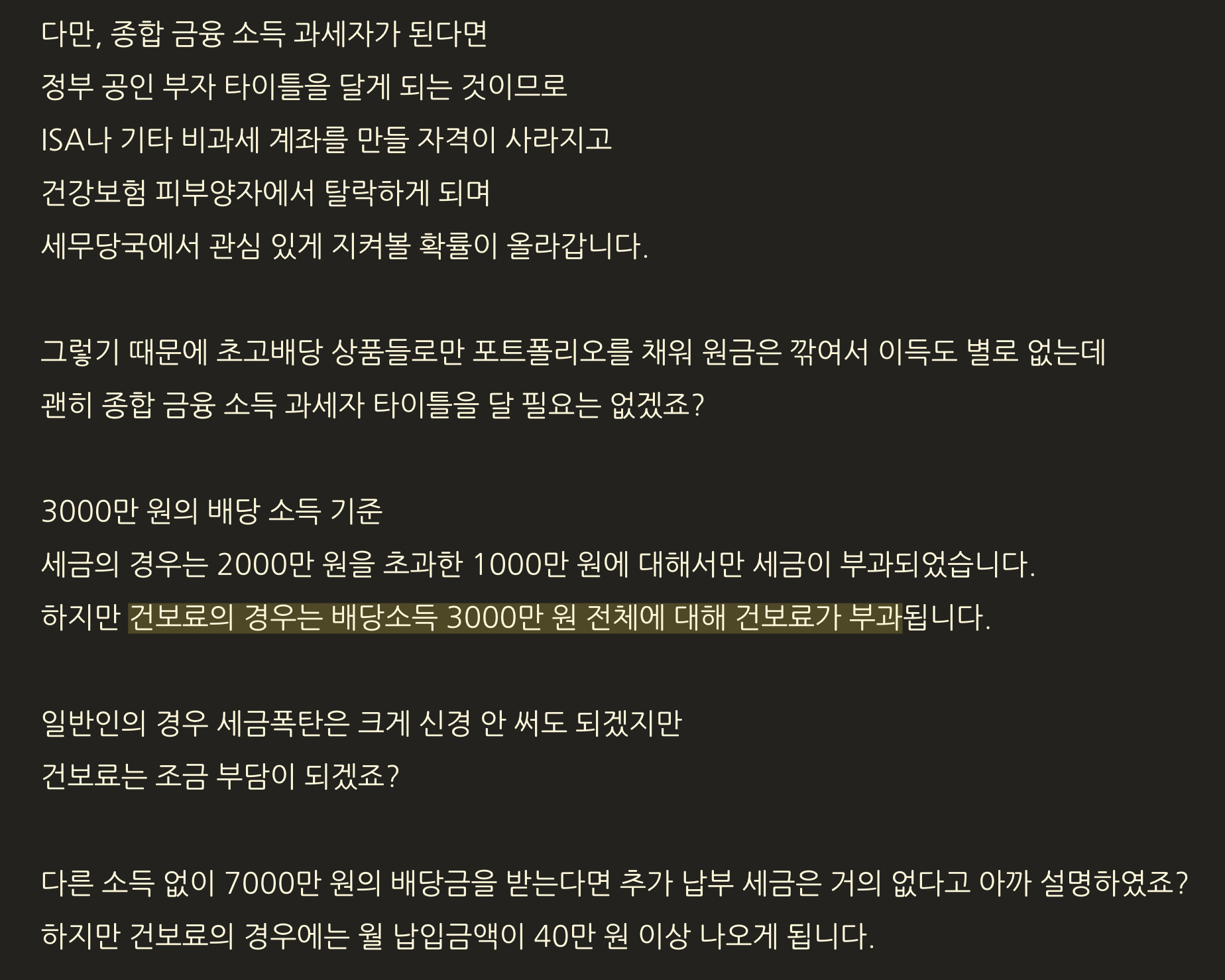 배당소득이 나오는 순간 배당소득 전부에 대한 건보료가 부과된다고 한다..