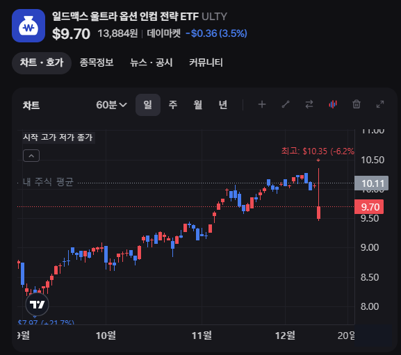 요건 ULTY가 배당락에 빠진 주가.. ㅠ 배당금만큼 빠지는 느낌..