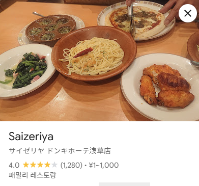 구글 평점 3.5점에 리뷰수 천개 Saizeriya · 일본 〒110-0005 Tokyo, Taito City, Ueno, 2 Chome−7−12 鈴本ビル 2F★★★★☆ · 패밀리 레스토랑www.google.com 타베로그는 늘 그렇듯 3.07점 サイゼリヤ 上野広