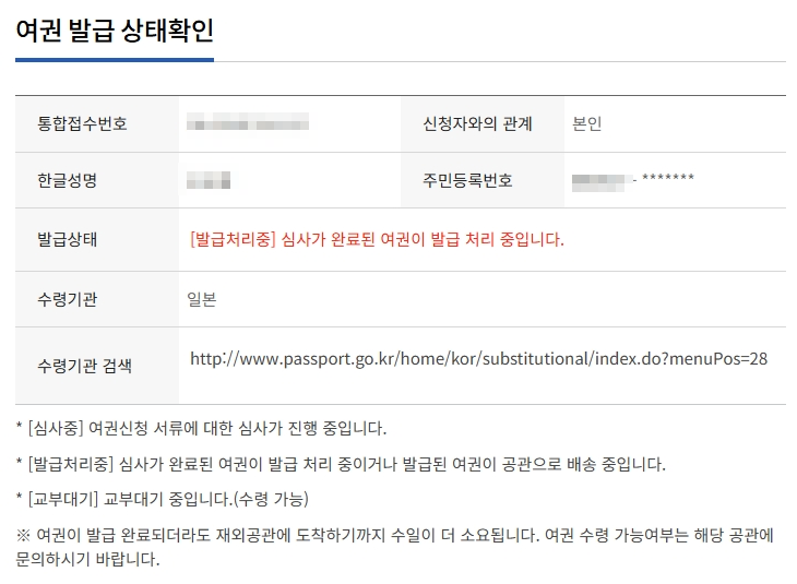 - 여권 수령 가능 통보를 받으면 지정된 수령기관(예: 주일본 대한민국 영사부)에 방문하여 수령합니다