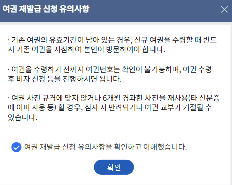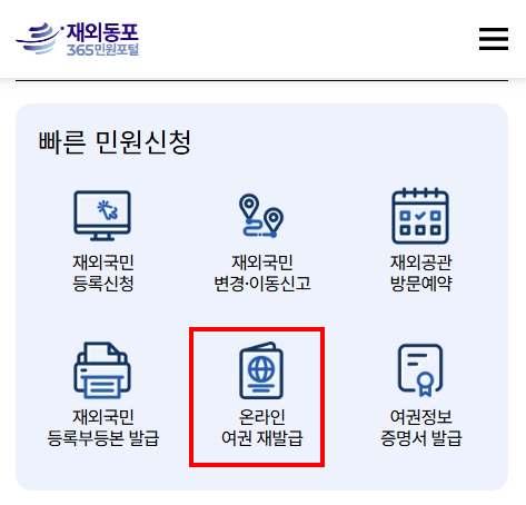 - '온라인 여권 재발급 신청' 버튼을 클릭합니다