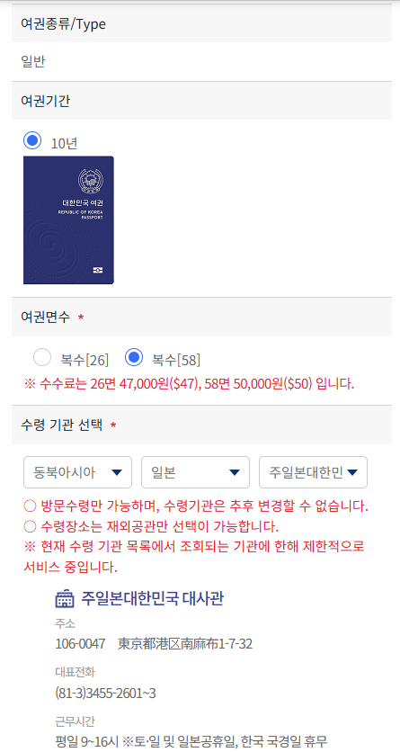 - 도쿄 거주자의 경우 주일본대한민국 대사관을 선택할 수 있습니다