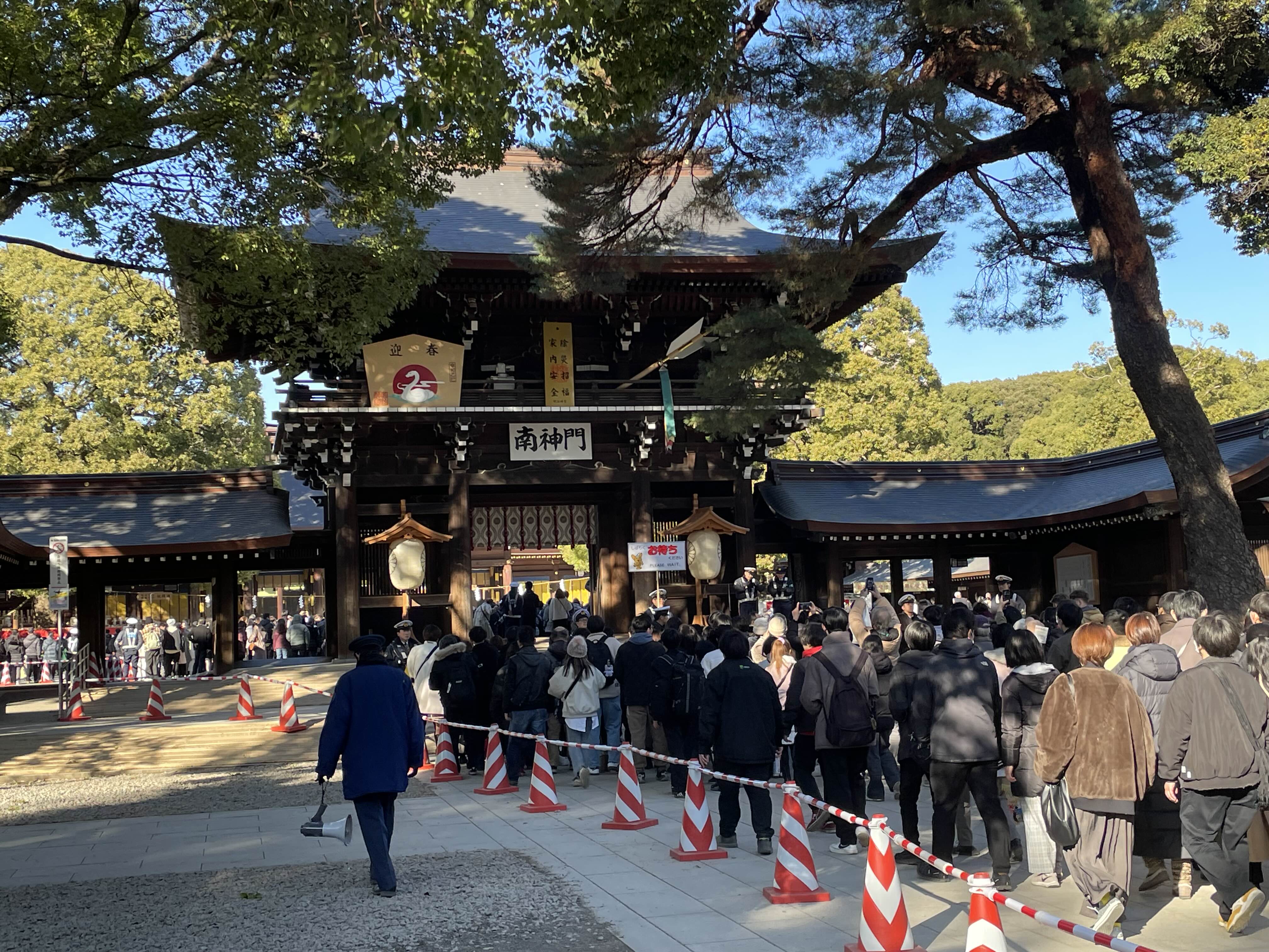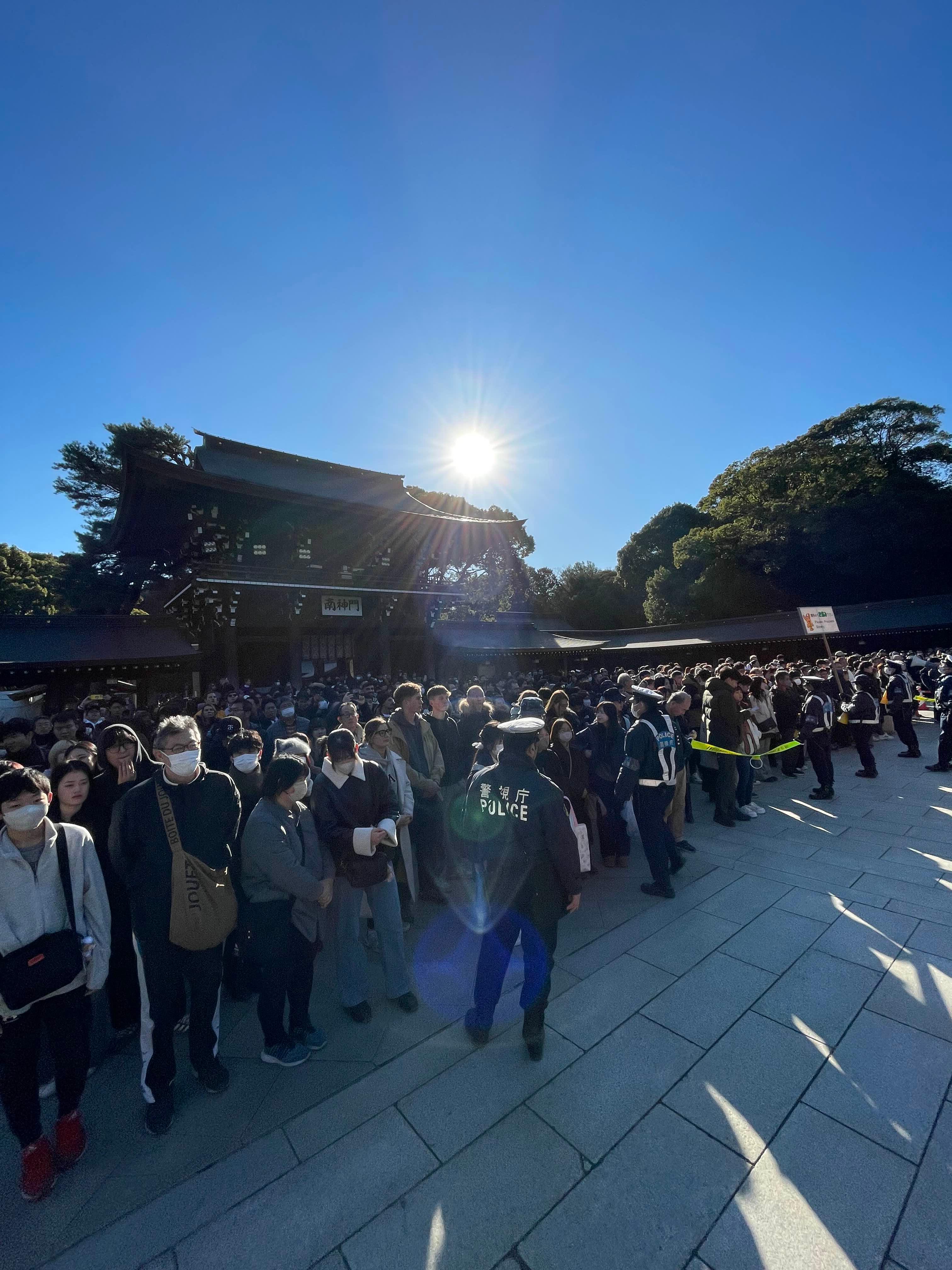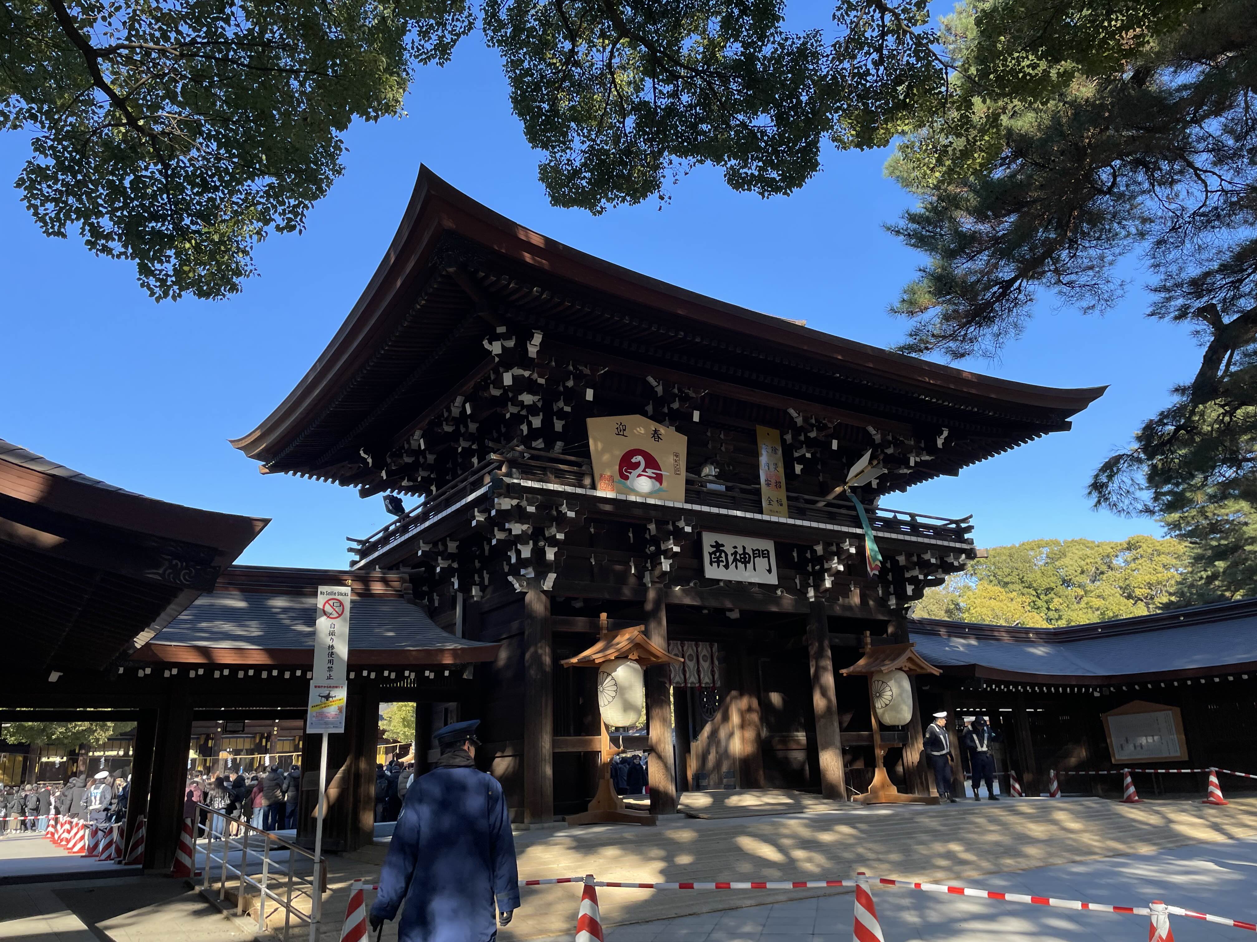 - 분위기: 사진 속의 수많은 인파는 일본 전역에서 가장 많은 참배객(약 300만 명)이 몰리는 메이지 신궁의 위엄을 보여줍니다. 경찰관들이 질서 유지를 위해 구역을 나누어 입장을 통제하는 모습도 흔히 볼 수 있습니다.