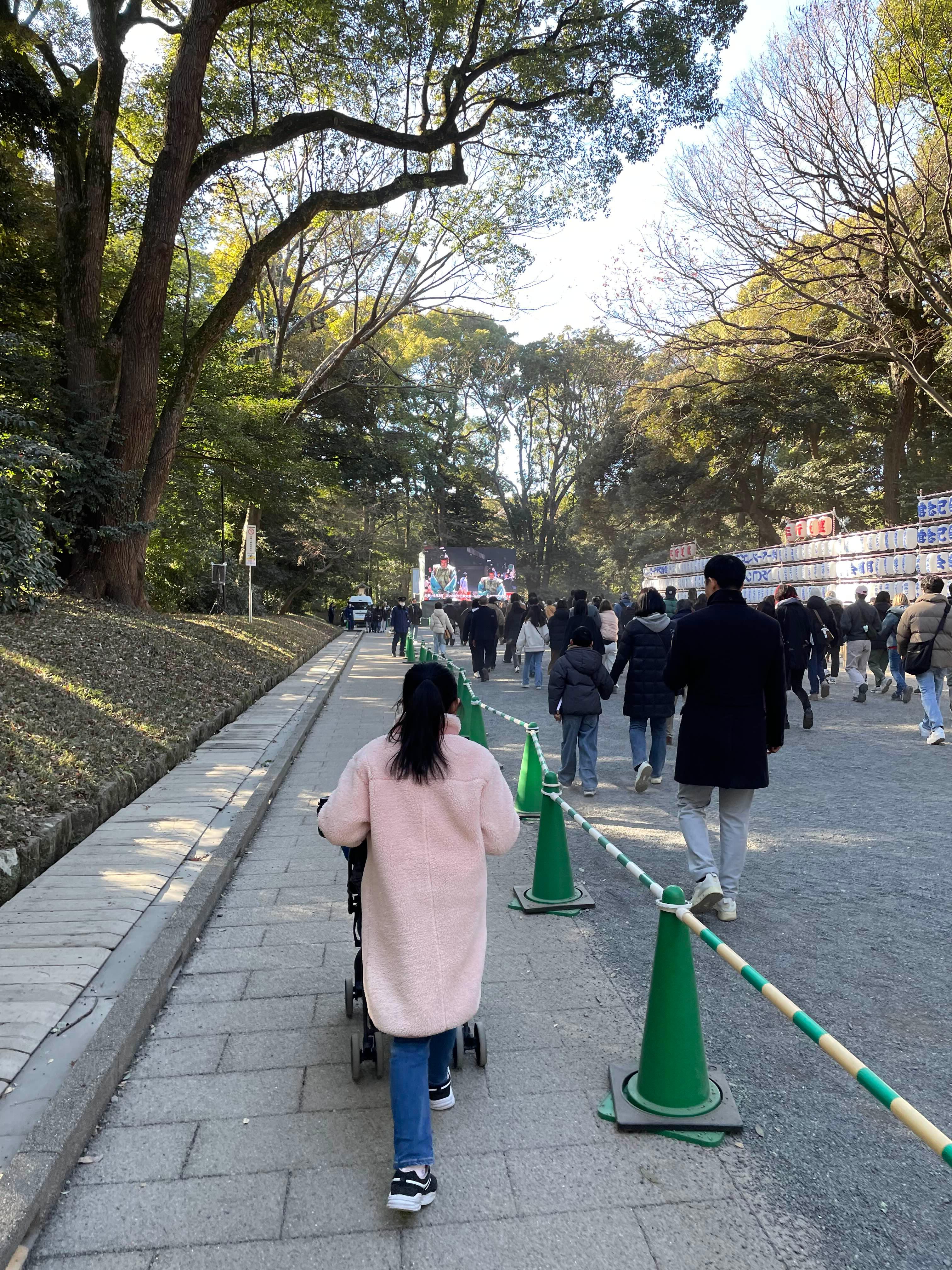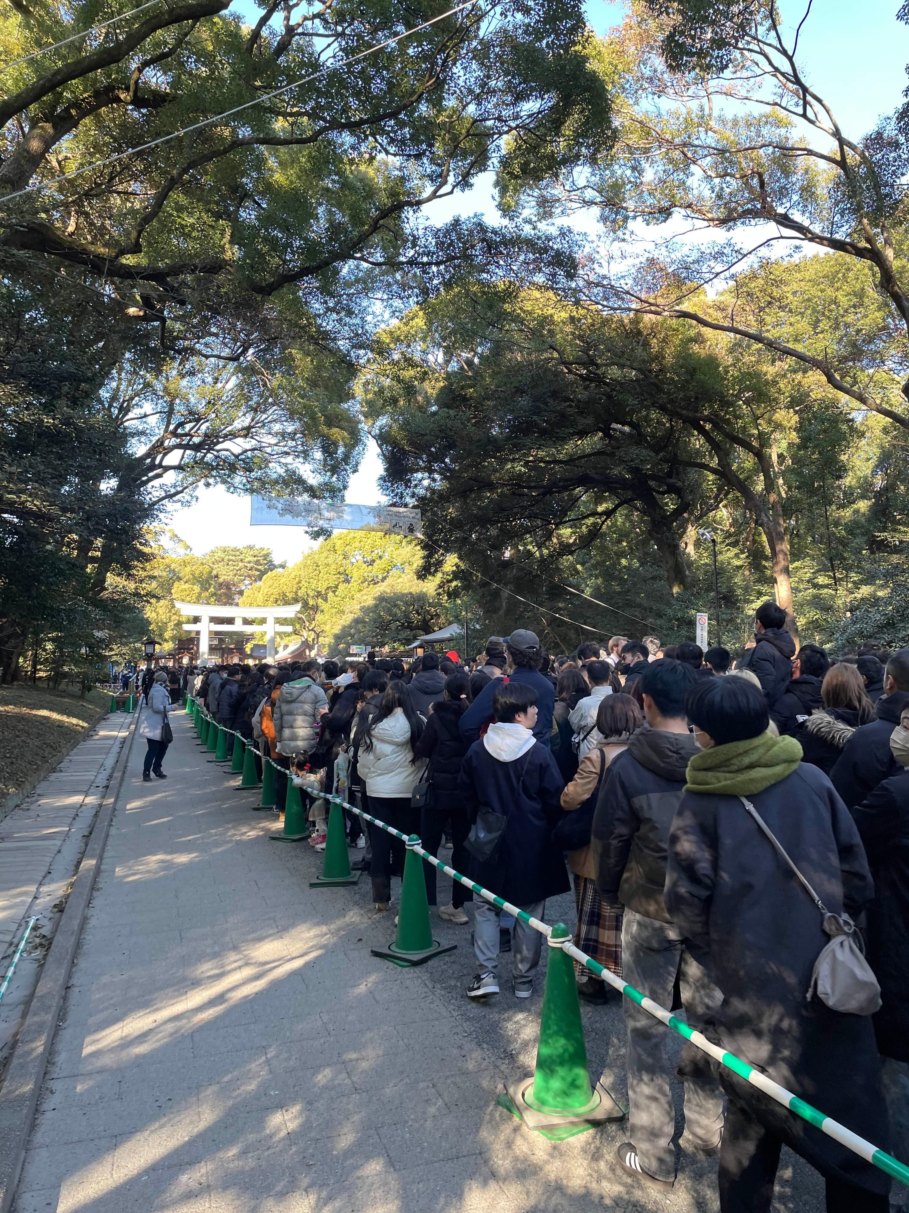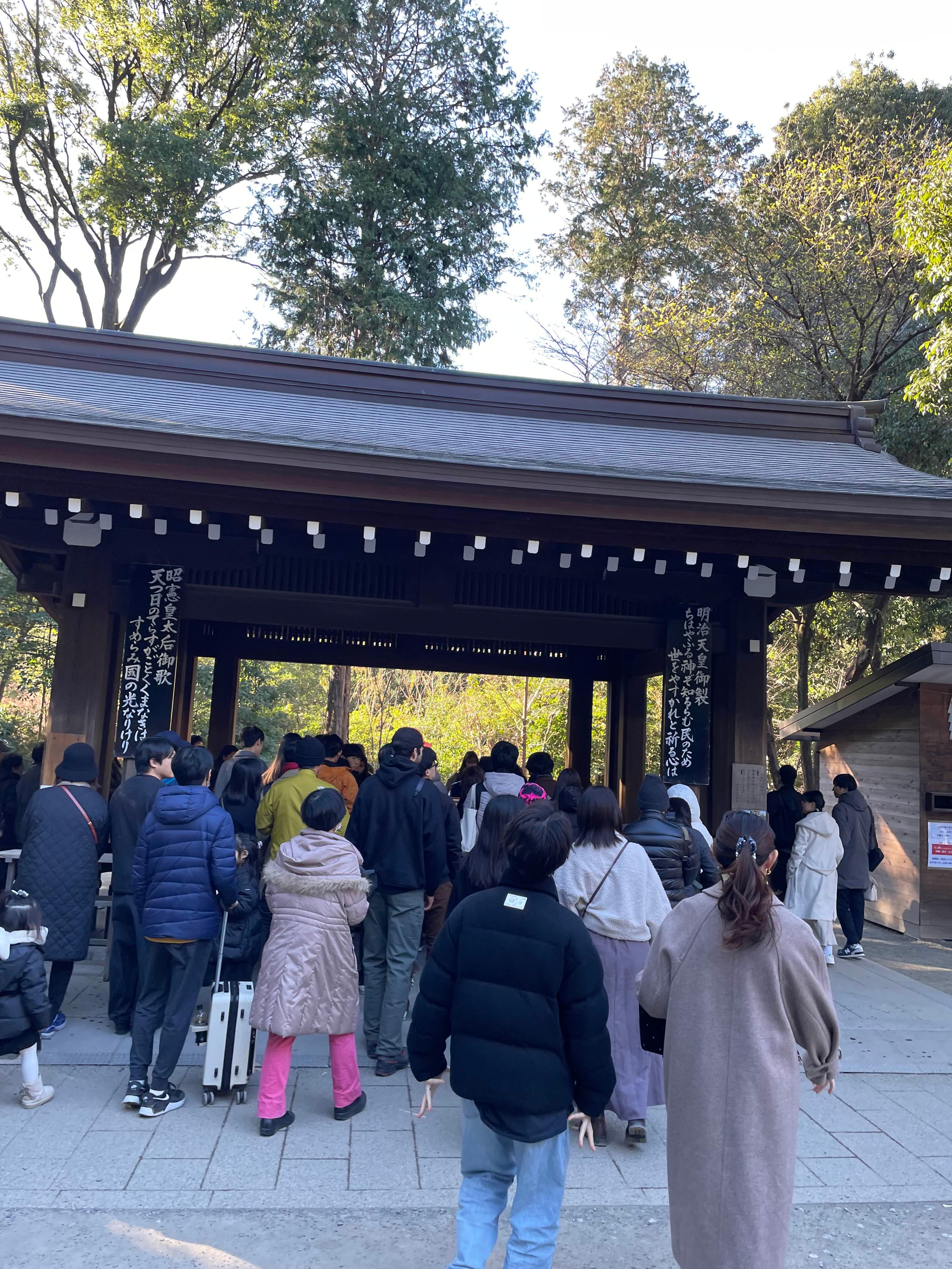 - 분위기: 사진 속의 수많은 인파는 일본 전역에서 가장 많은 참배객(약 300만 명)이 몰리는 메이지 신궁의 위엄을 보여줍니다. 경찰관들이 질서 유지를 위해 구역을 나누어 입장을 통제하는 모습도 흔히 볼 수 있습니다.