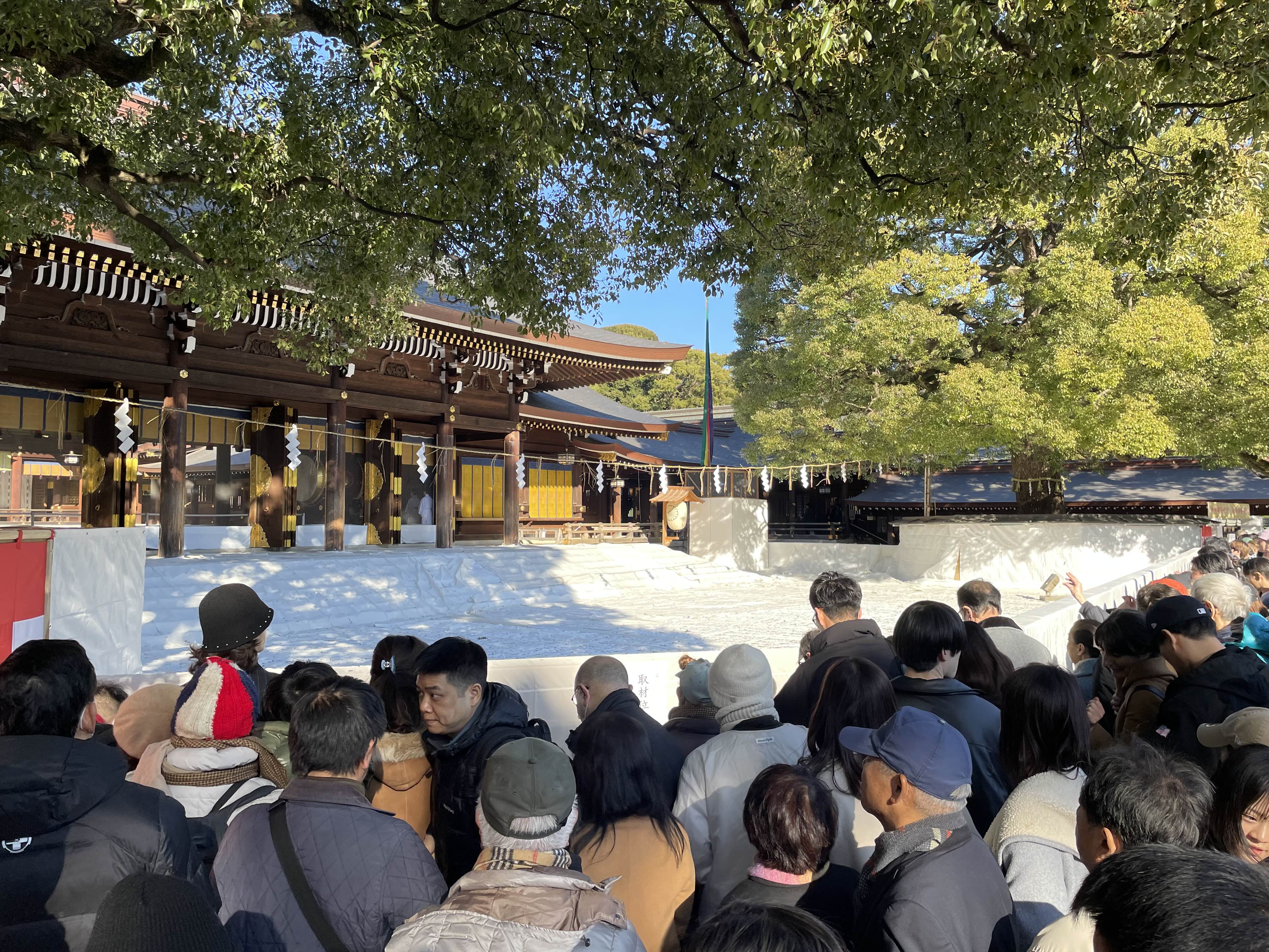 사진은 일본의 새해 첫 참배인 '하츠모데' 기간 동안 메이지 신궁 본전 앞의 특별한 풍경을 보여줍니다.