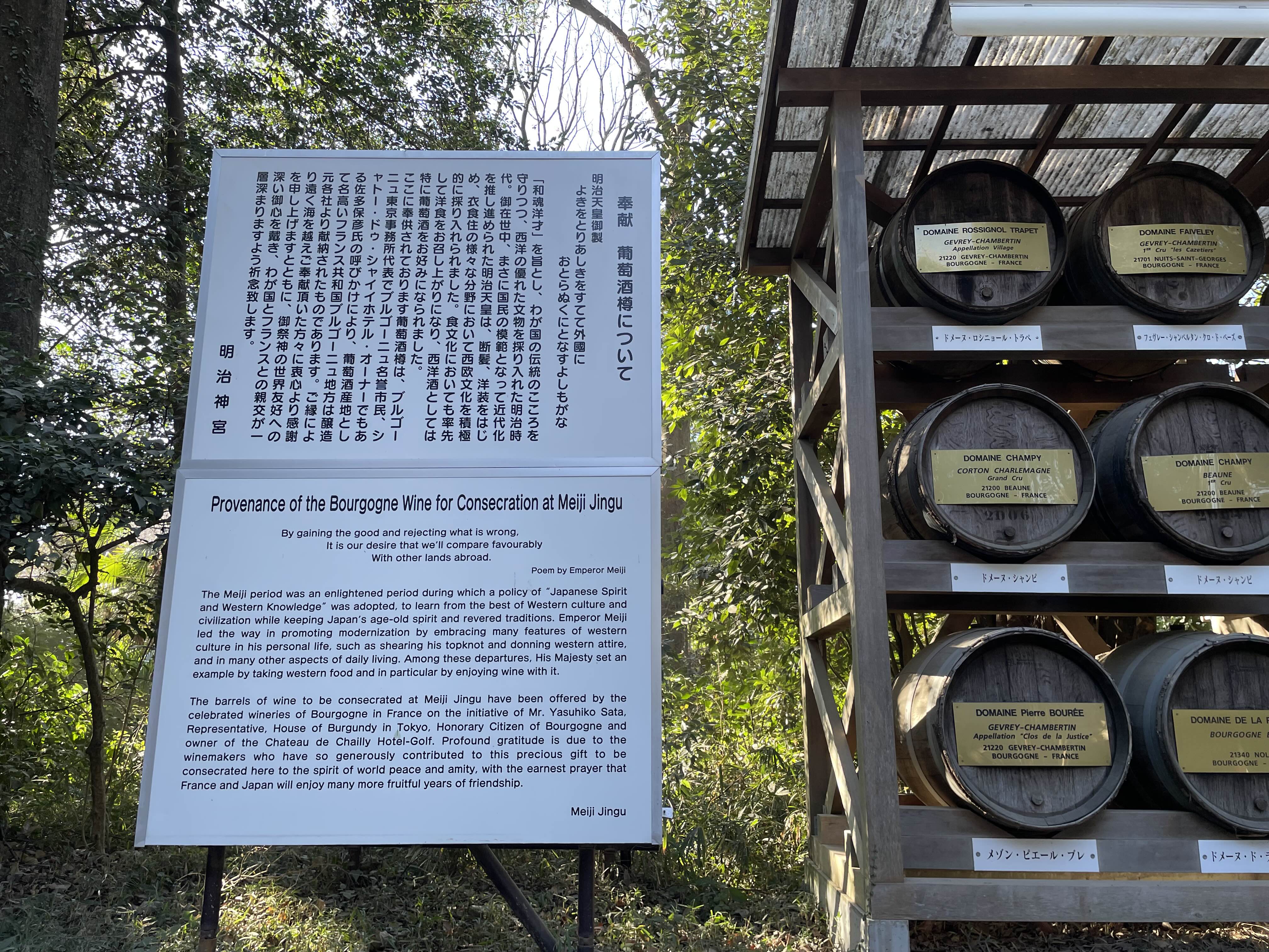- 역사적 배경: 메이지 일왕이 일본의 근대화를 위해 서양 문물을 적극적으로 수용하고 실제로 와인을 즐겼던 것을 기리기 위해, 프랑스 부르고뉴 지방의 유명 양조장들이 뜻을 모아 기증한 것입니다.