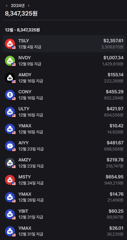 (배당투자) '24년 12월 4주차 YMAX TSLY YBIT 일드맥스 투자 성과