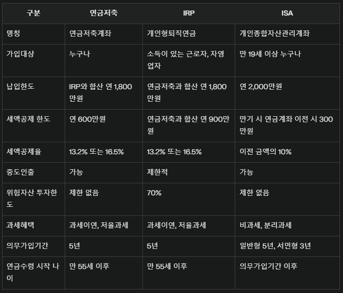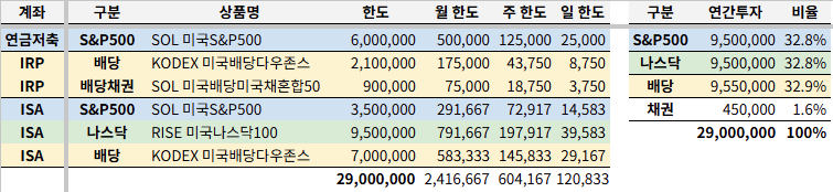 그래서 아래와 같이 연금저축 / IRP / ISA 3개의 축을 모두 돌리기로 했다