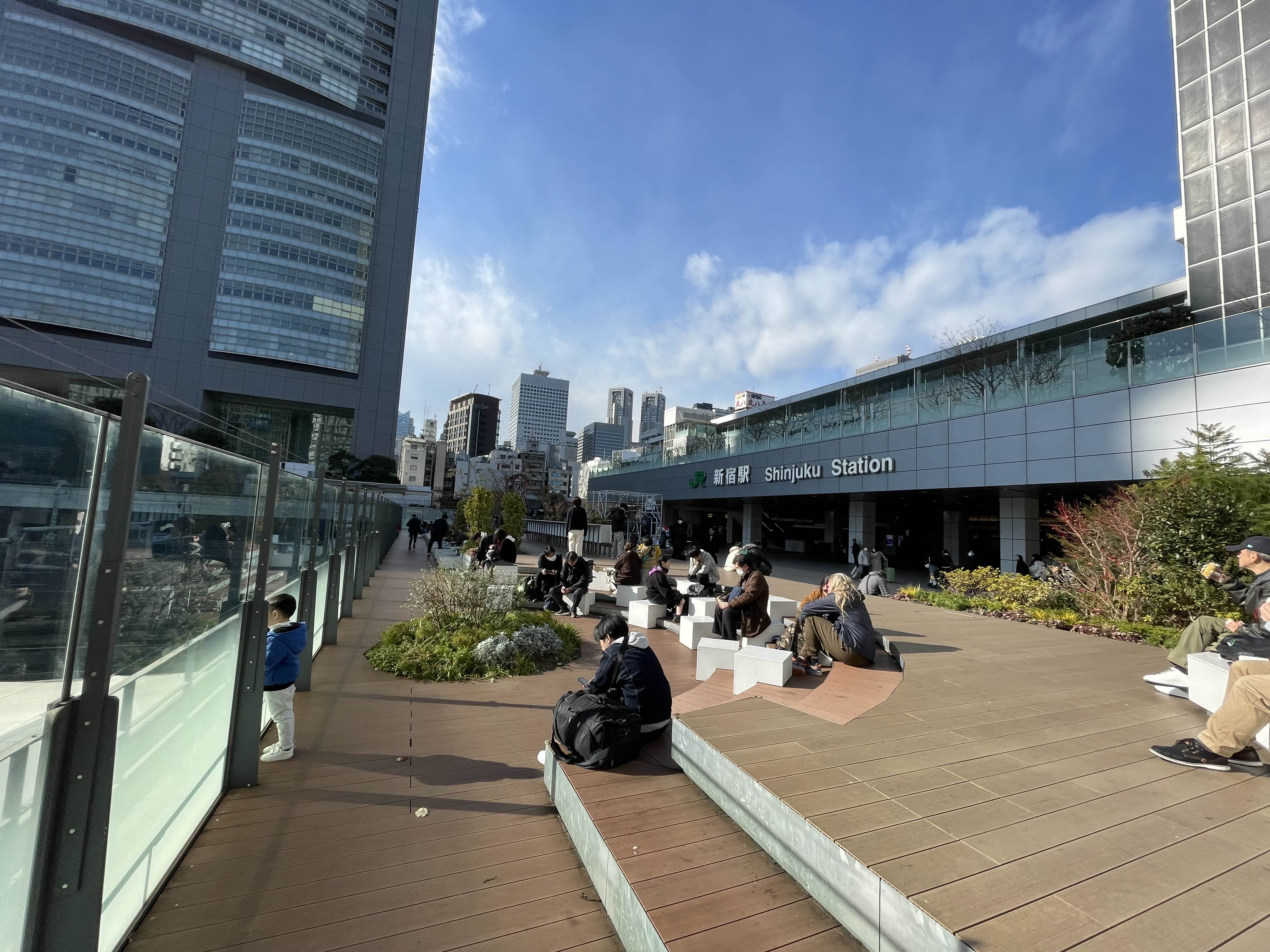 신주쿠 역에서 오손도손 사람들이 앉아있다