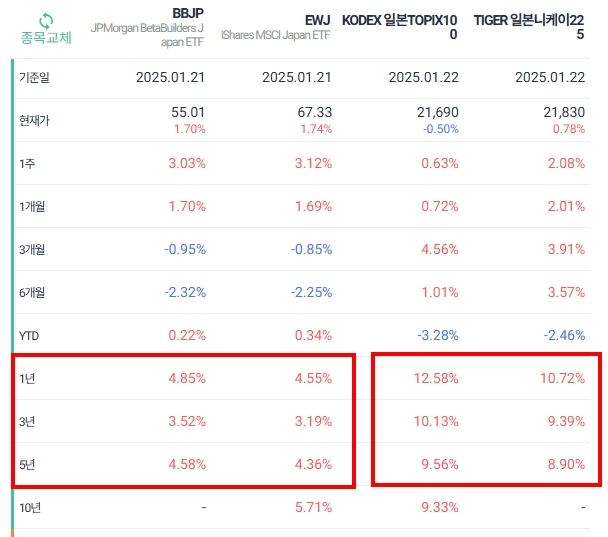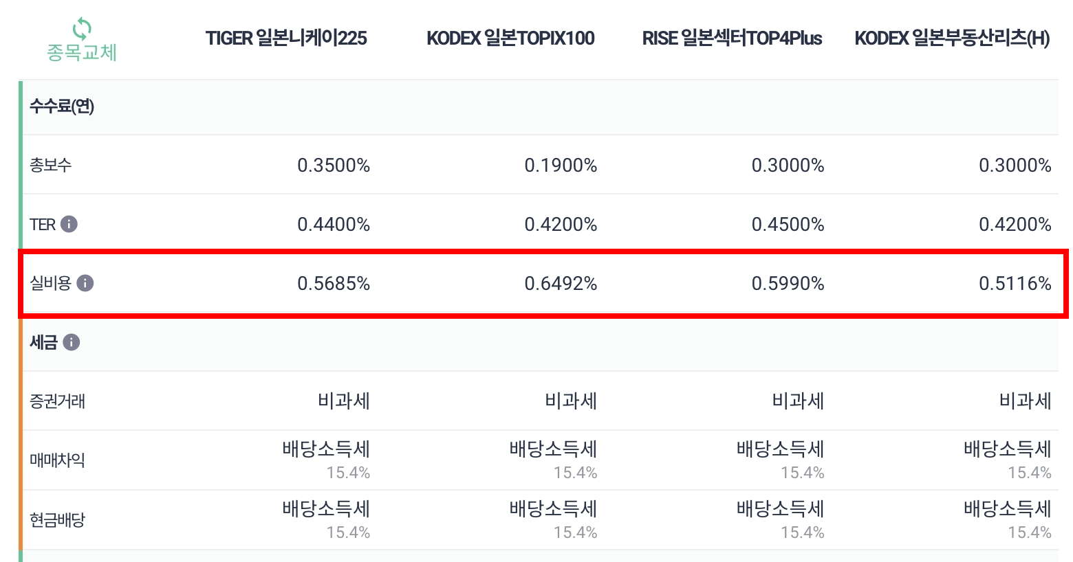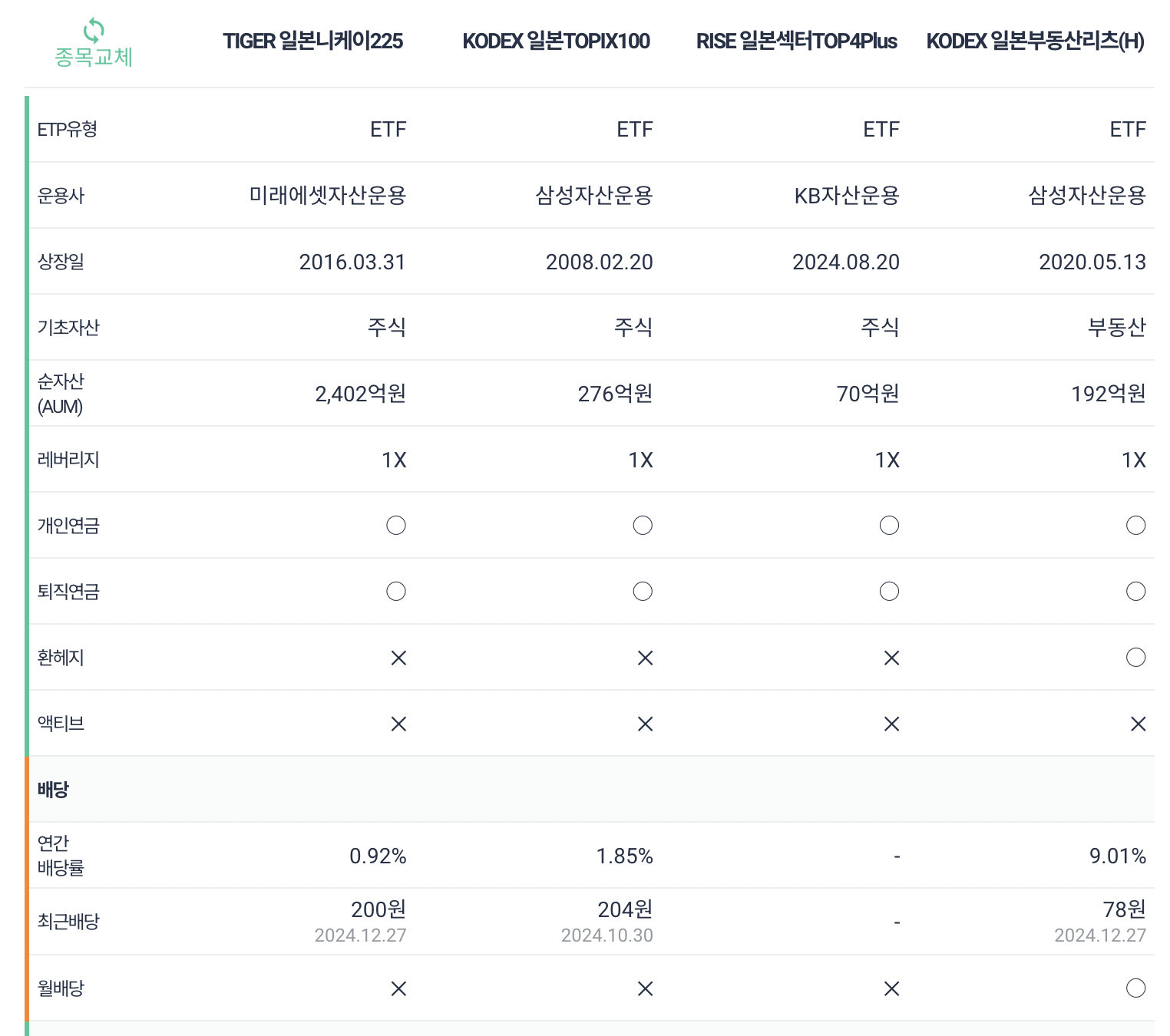 - 미국 상장 일본 ETF: 운용보수가 낮고 대형 상품이 많아서 장기 추적오차가 작을 수 있으나, 환전 비용과 해외주식 양도소득세 신고 등 번거로움 존재.