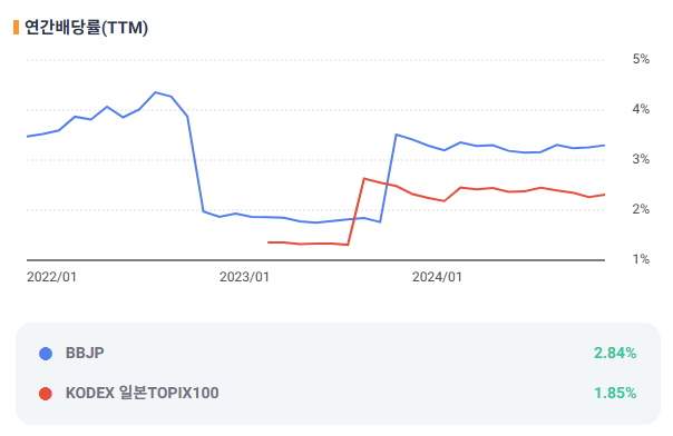 결국 차이는 구성종목이 더 다양하게 분산되어있는 BBJP가 수익률이 더 낮게 나오는것인지..