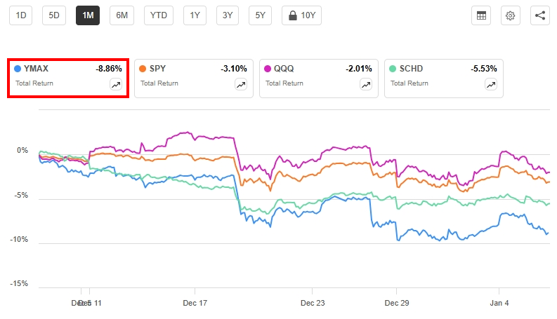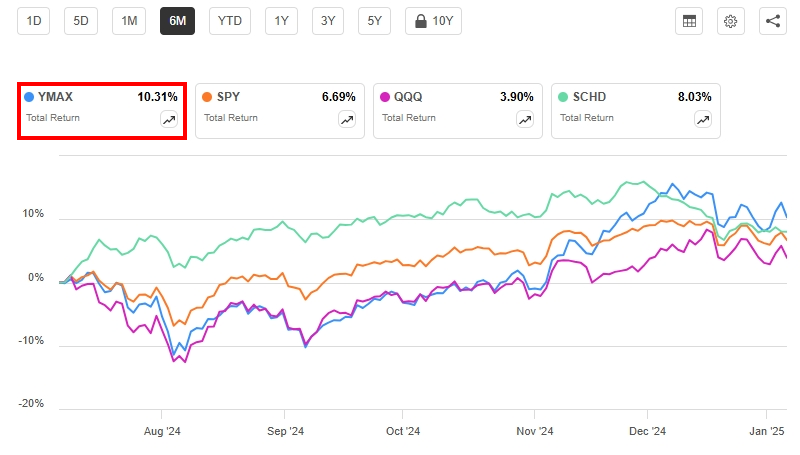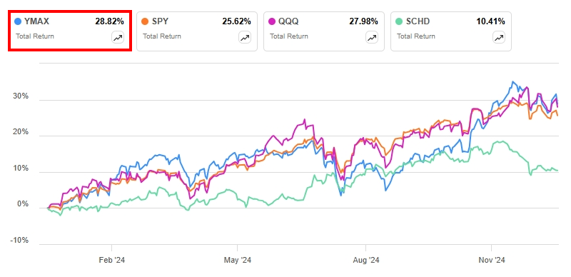 자 그러면 YMAX가 출시된지 최근 1년간의 Total Return 차트를 SPY와 QQQ, SCHD와 비교해보자