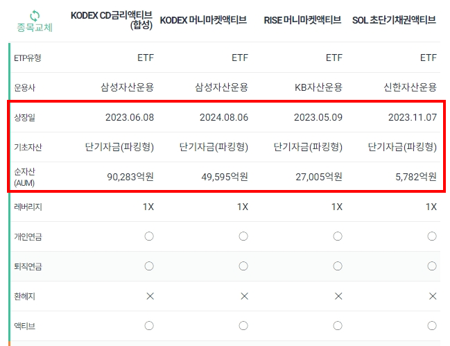 MMF : KODEX 머니마켓액티브 / RISE 머니마켓액티브 / KIWOOM 머니마켓액티브