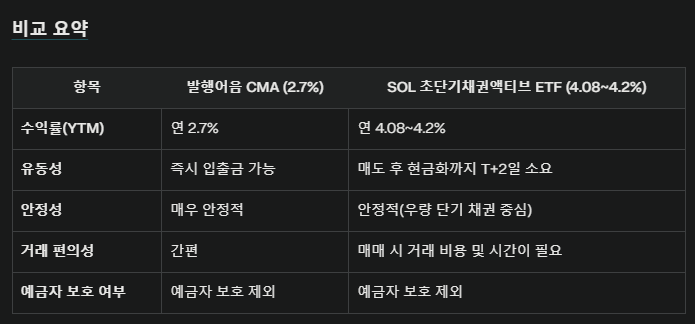 - 높은 수익률을 목표로 하고, 약간의 유동성 제약을 감수할 수 있다면 SOL 초단기채권액티브 ETF가 더 나은 선택입니다.