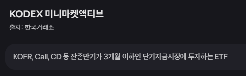 이건 KOFR, Call, CD 등 잔존만기가 3개월 이하인 단기자금 시장에 투자한다고 한다