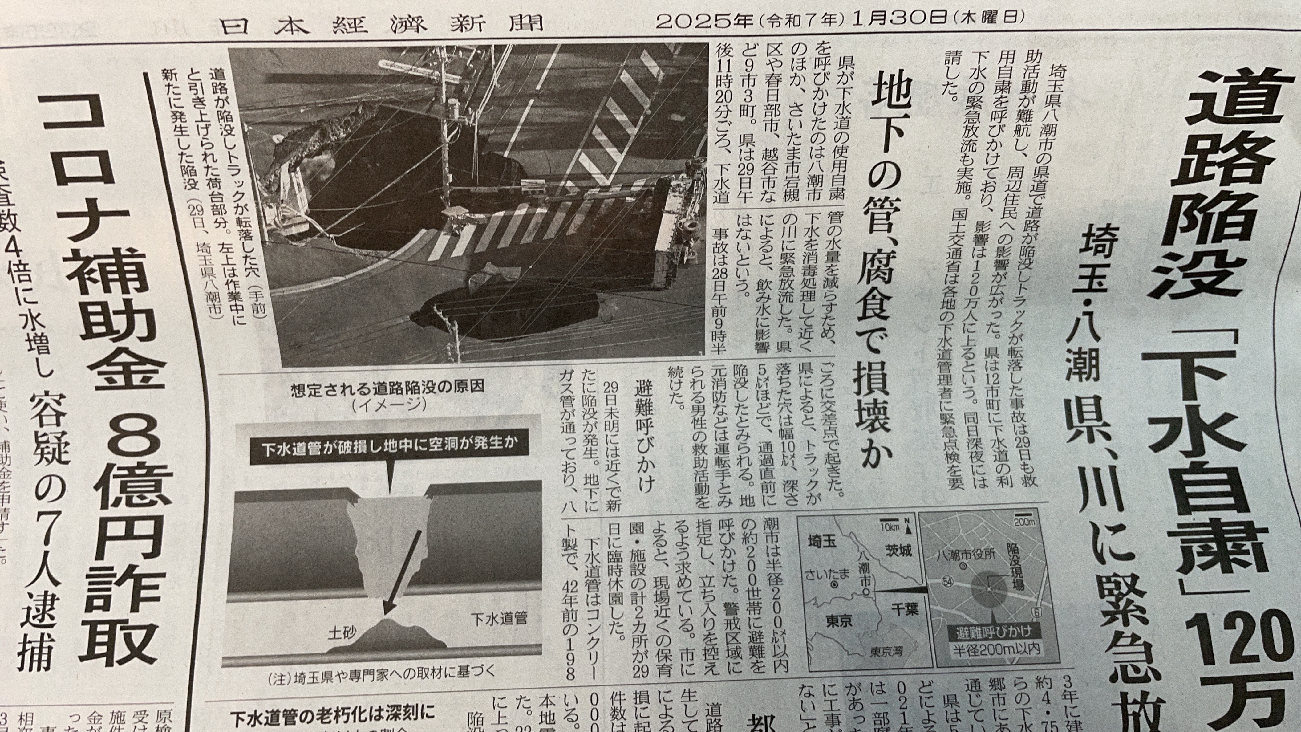 첨부하신 신문 기사는 2025년 1월 30일 자로 보도된 사이타마현의 대형 도로 함몰 사고와 그 여파를 다루고 있습니다.