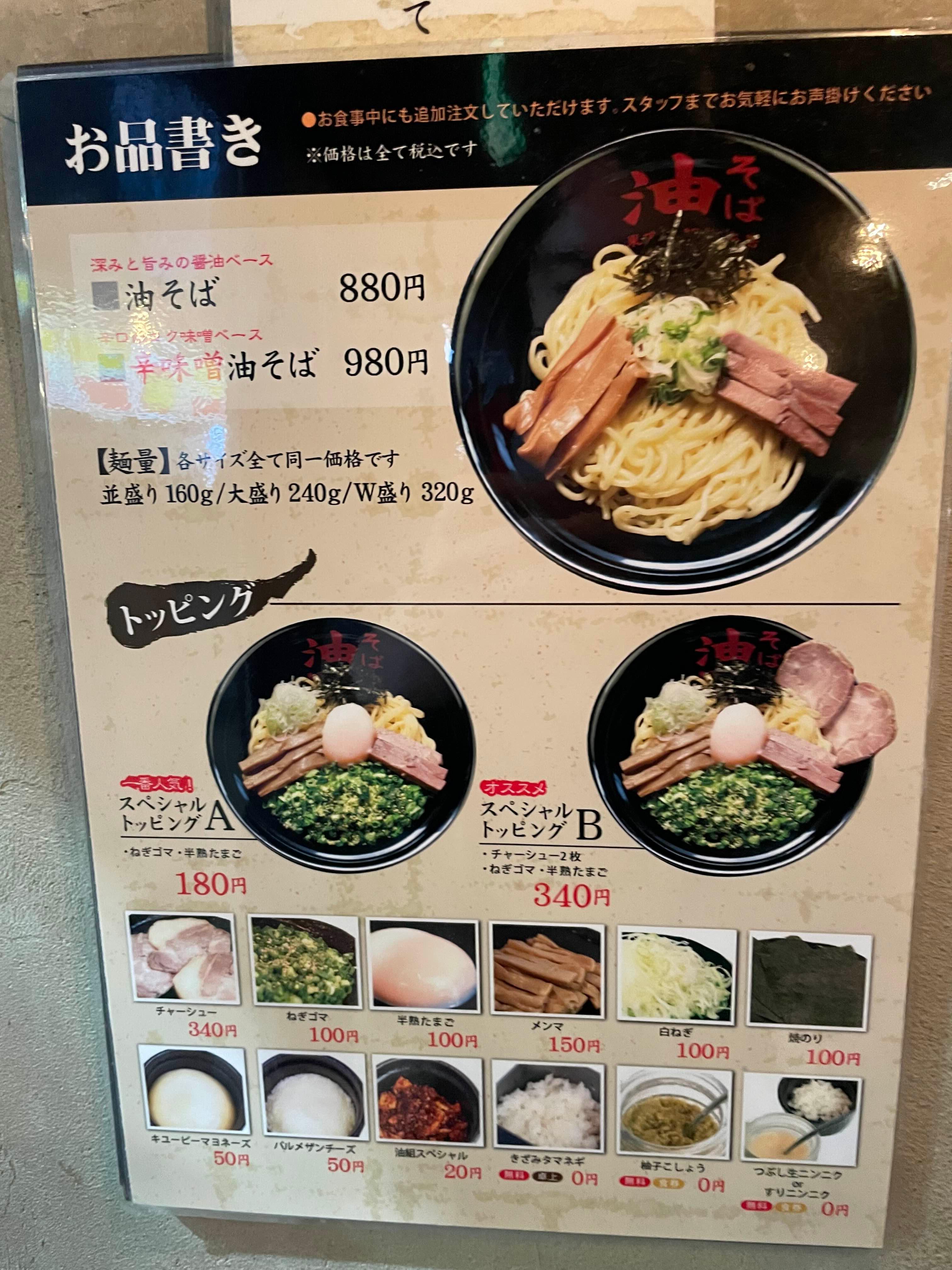 - 동일 가격의 푸짐한 양: 국물 없는 '아부라소바' 전문점으로, 면의 양을 보통(160g), 대(240g), 특대(W, 320g) 중 어느 것을 선택해도 가격이 똑같아 가성비가 훌륭합니다.