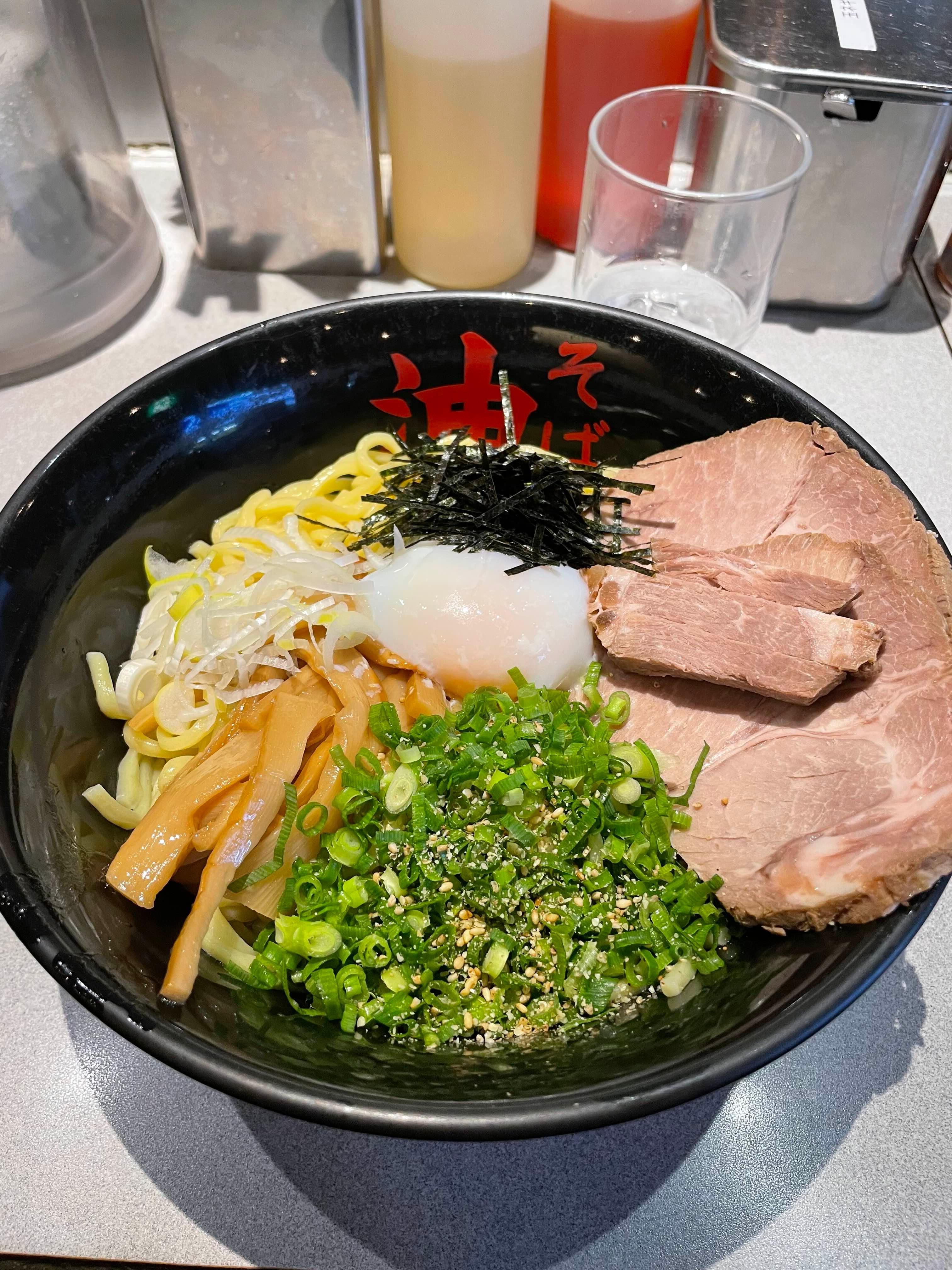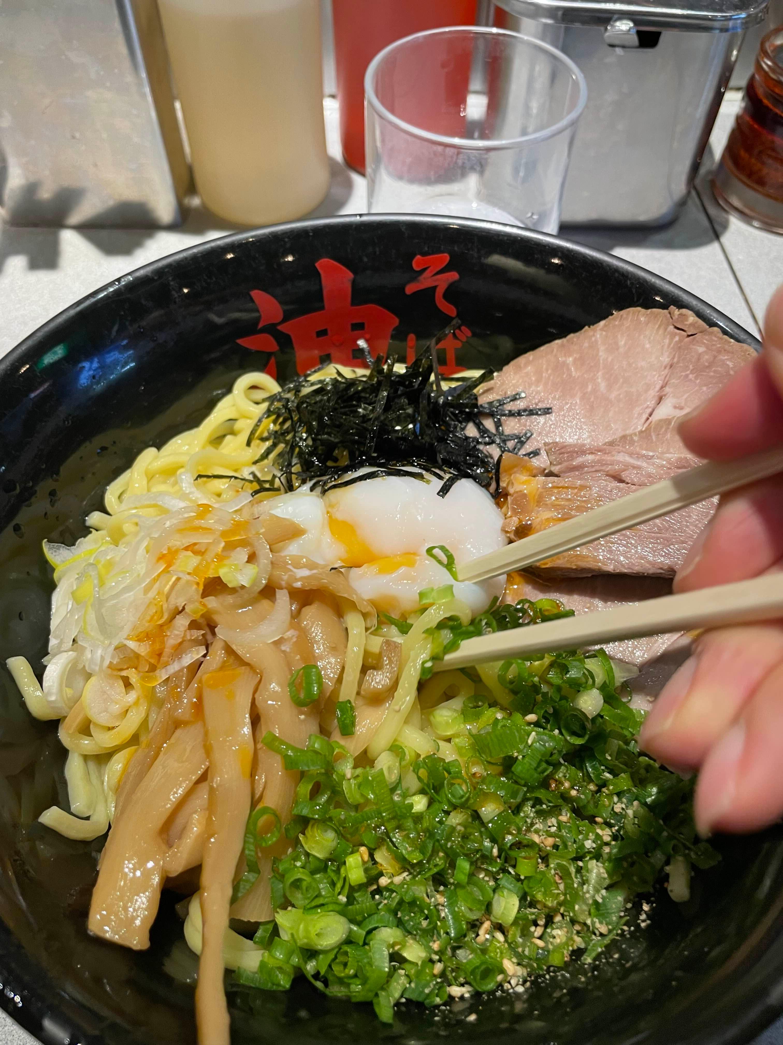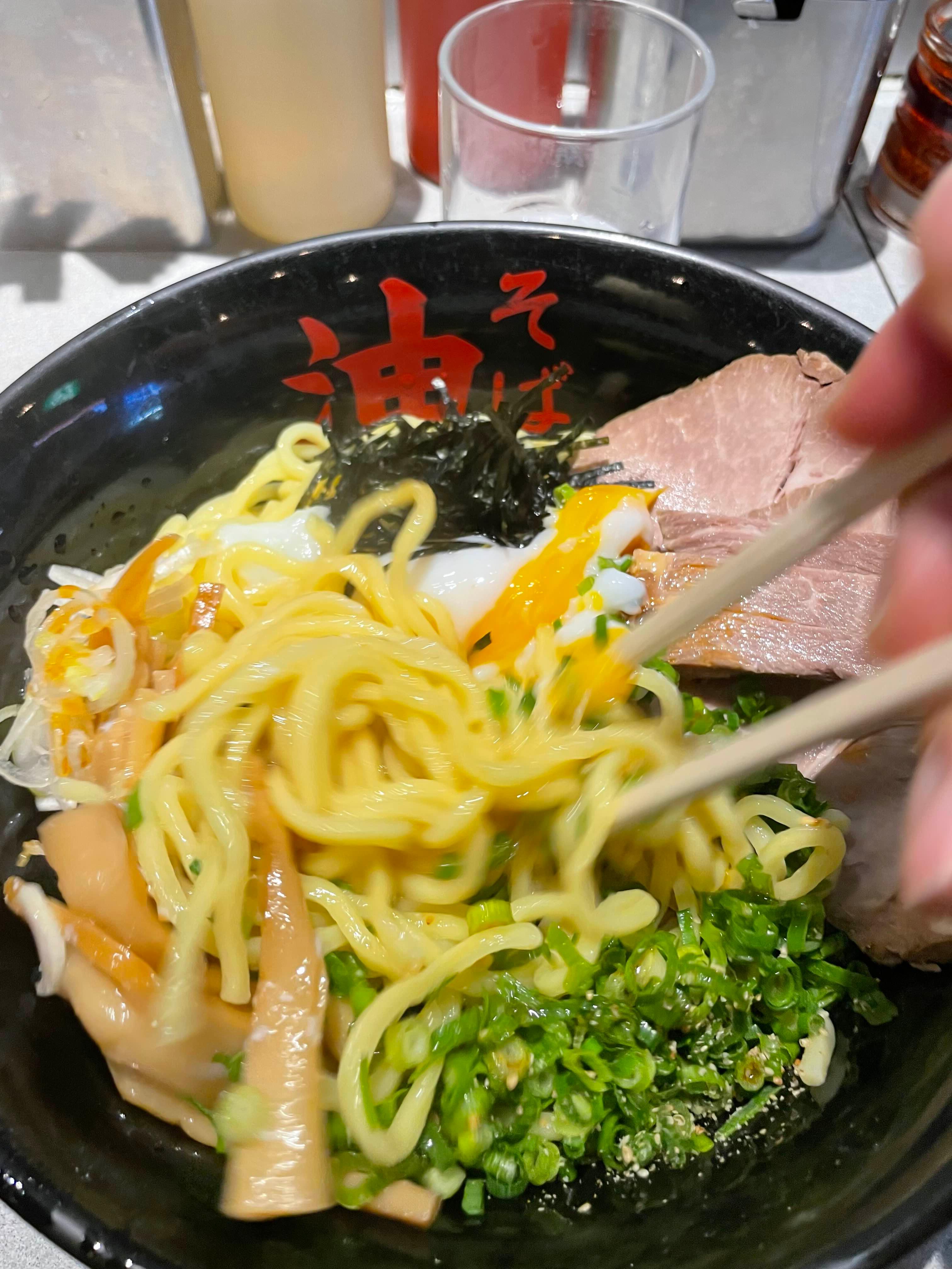 라멘 면을 사용하지만, 국물 라멘과 구별하기 위해 '기름 국수'라는 직관적인 이름을 붙인 것이죠.