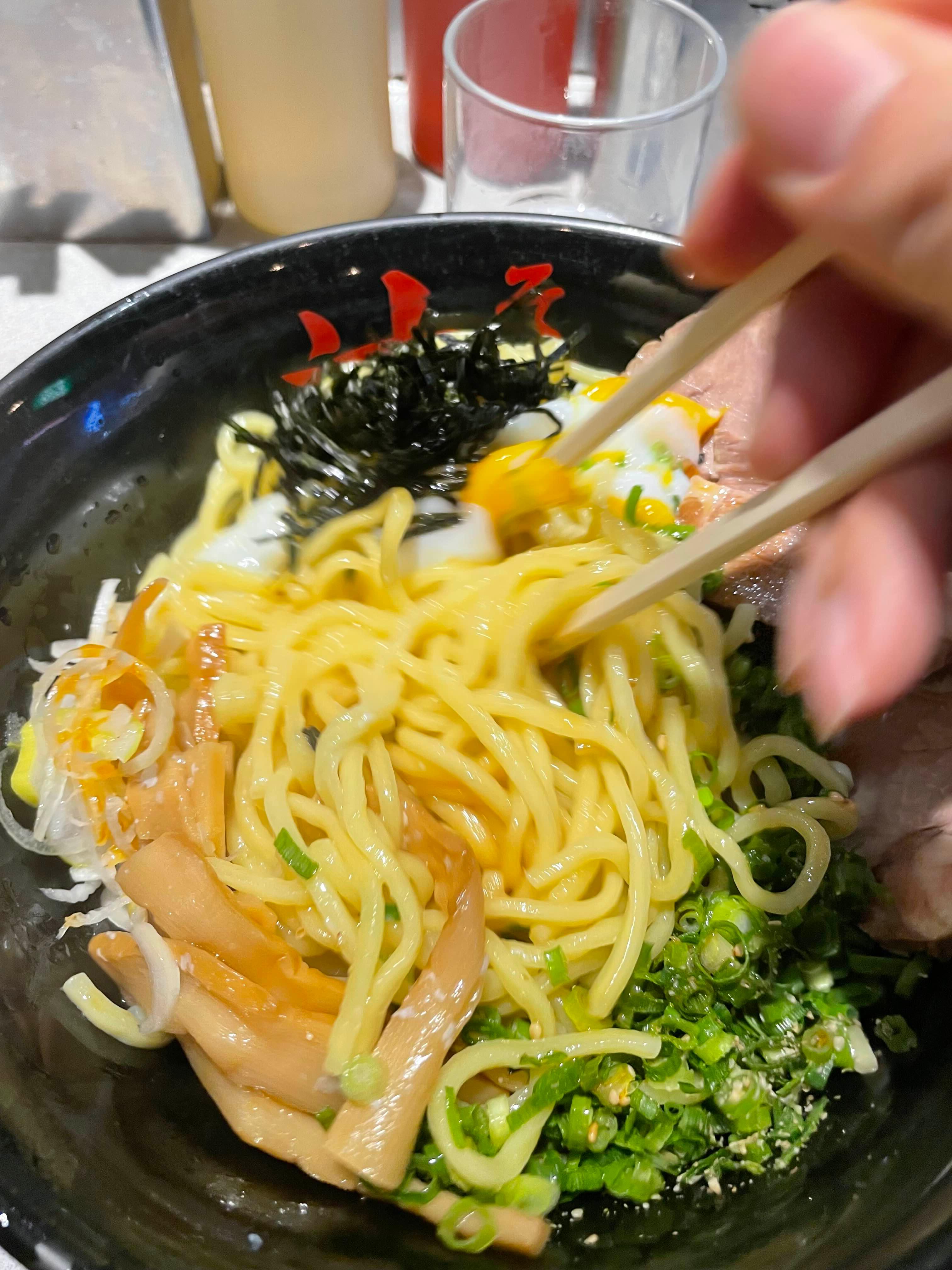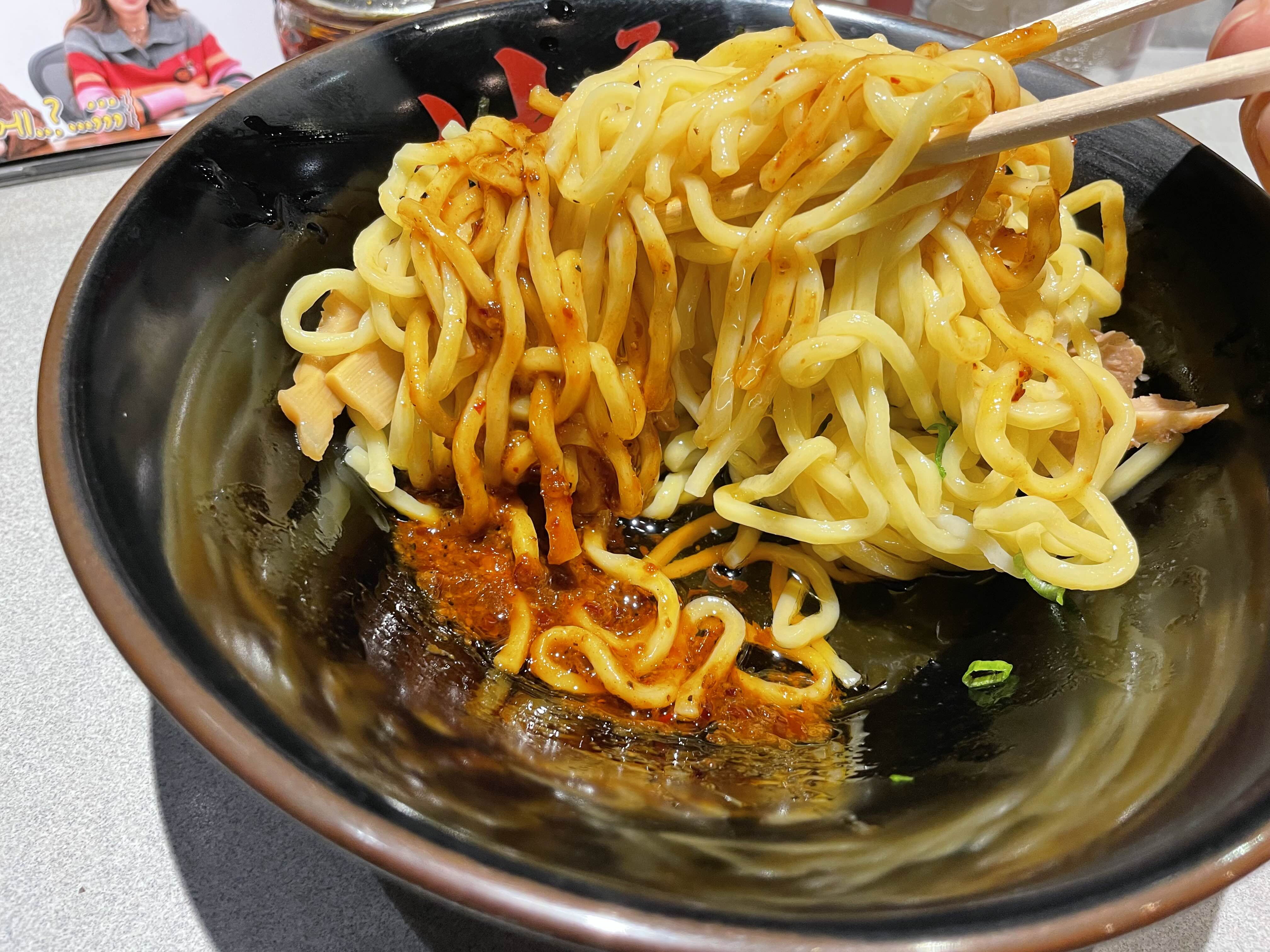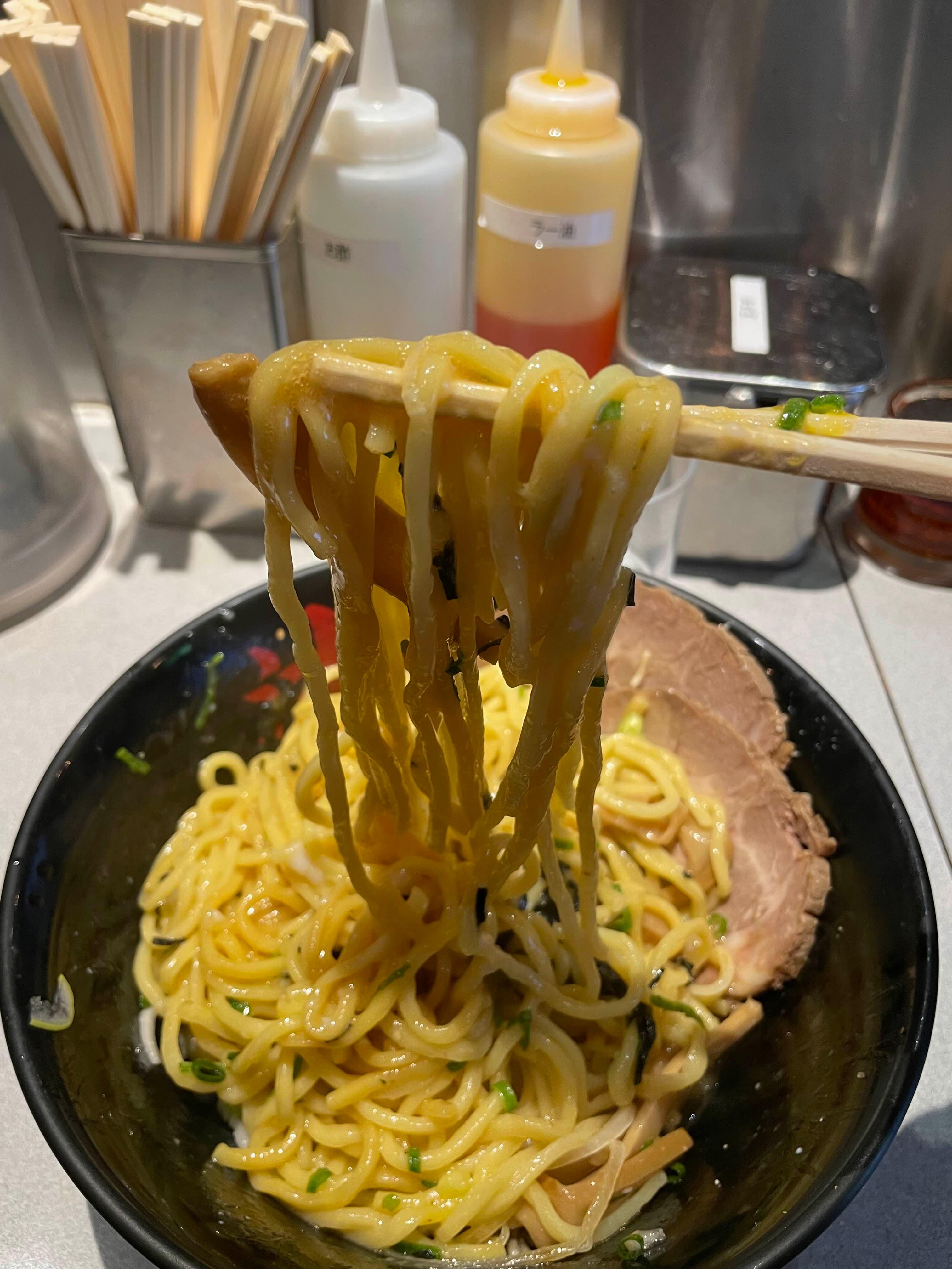 라멘 면을 사용하지만, 국물 라멘과 구별하기 위해 '기름 국수'라는 직관적인 이름을 붙인 것이죠.